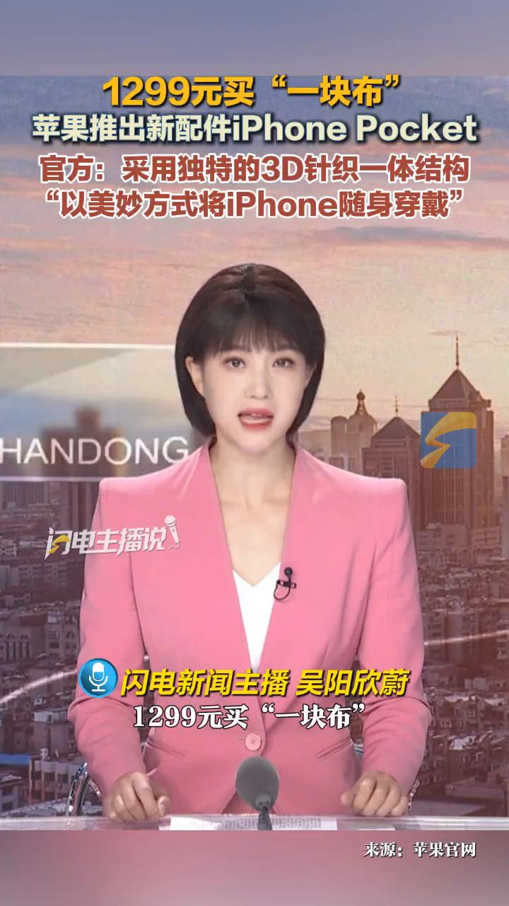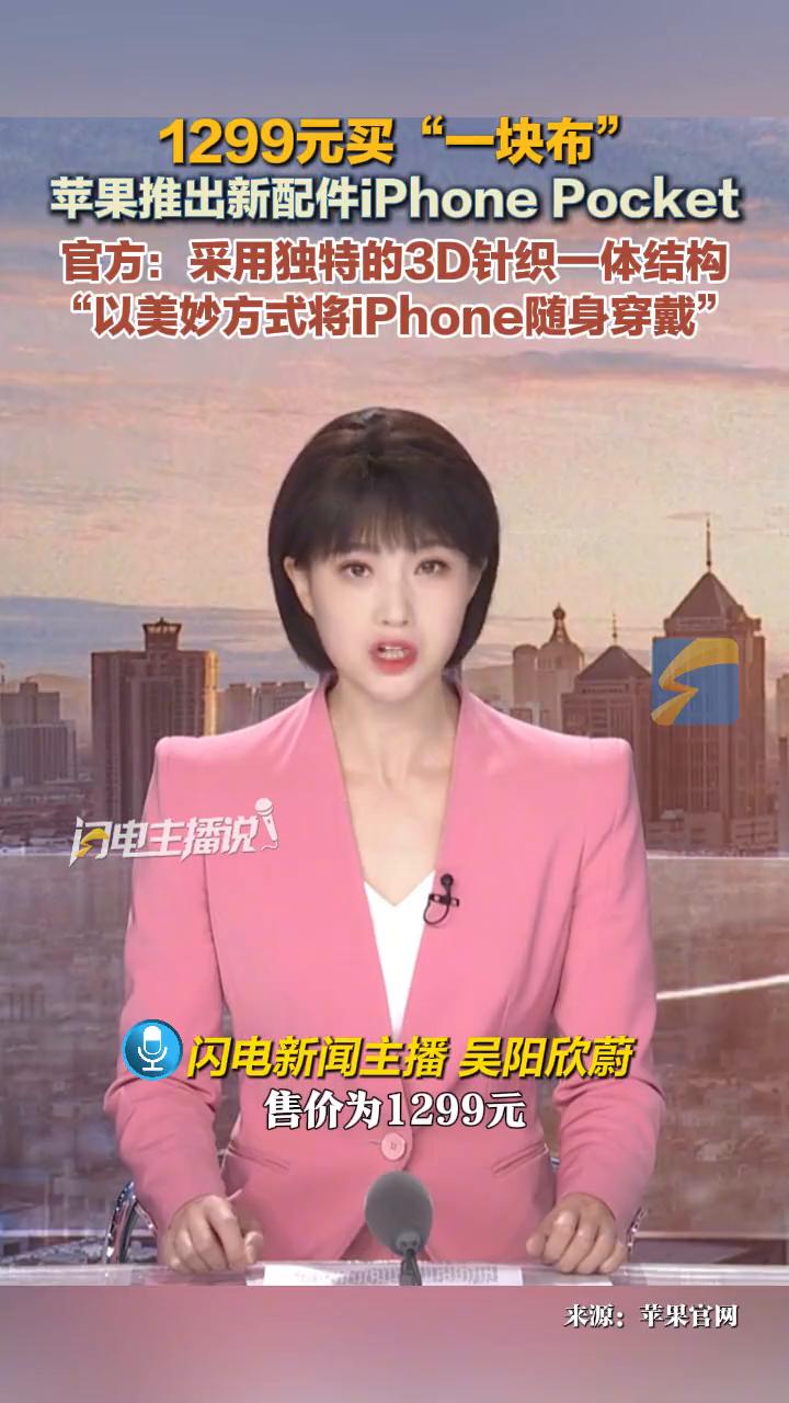 1299元买"一块布",苹果推出新配件iPhone Pocket。官方:采用独特的3D针织一体结构,"以美妙方式将iPhone随身穿戴"。 闪电新闻主播吴阳欣蔚。 1299元买"一块布",苹果推出新配件,官方称其"以美妙方式将iPhone随身穿戴"。11月11日据苹果官网消息,三宅一生携手苹果正式推出iPhone Pocket。短带款提供八种色彩外观,售价为1299元,长带款售价为1899元。 这款产品的设计灵感源自"一块布",采用独特的3D针织一体结构,可适配所有iPhone以及其他随身小物。官方表示这款配件"以美妙方式将iPhone随身穿戴"。iPhone Pocket将于11月14日起开售,可手持系在包上或直接佩戴在身上。