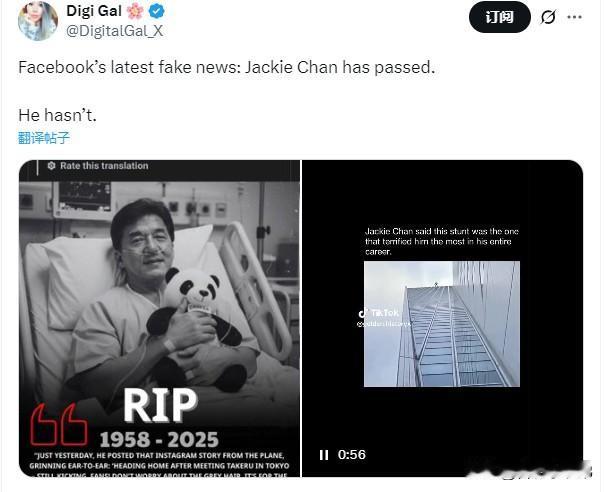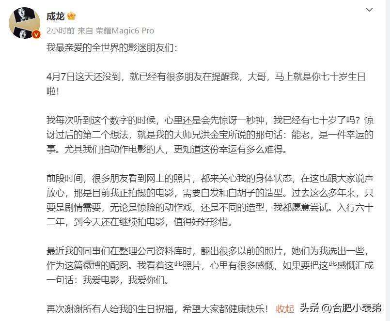 但谣言根本站不住脚——11月11日成龙还亲自发博为新电影宣传,状态在线,所谓“去世”纯属无稽之谈!多家媒体证实,这类不实帖文是AI生成的虚假信息,就为了博眼球蹭流量。 成龙大哥数十年拍戏攒下不少伤病是真,但健康状况一直稳定,大家千万别被虚假信息带偏!网络时代信息杂乱,一定要多核实来源,警惕AI造谣,别让不实消息误导他人~