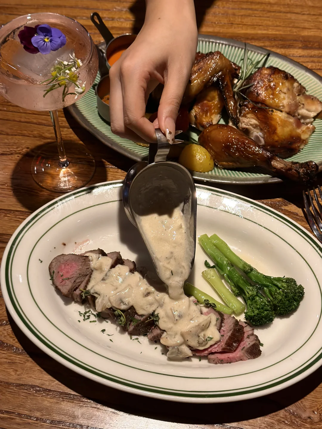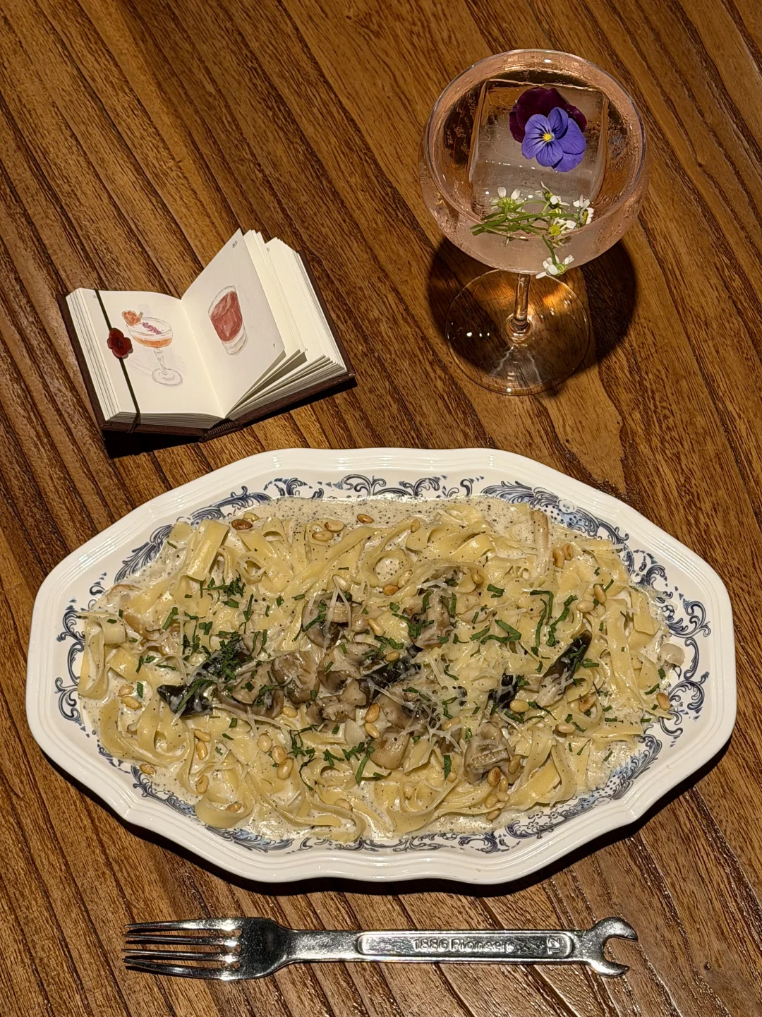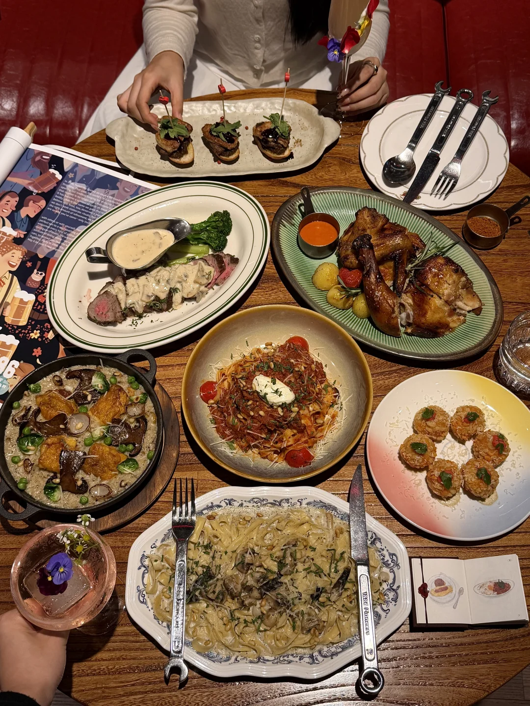 在上海又花小钱装大杯了🥹可以看到东方明珠! - ✔️黑松露蘑菇意面 每一根意面都裹满浓郁黑松露酱🍜嗦得停不下来! ✔️鲜牛肝菌鸡肉炖饭 鸡肉jujuju嫩搭配大块牛肝菌和炖饭~口感层次贼丰富🤤!! ✔️奶油蘑菇牛排 牛排蘸上奶油蘑菇酱🥩奶呼呼奶香浓郁!! ✔️鸡尾酒 喝了好多杯漂亮酒都还蛮有特色🫧酸酸甜甜嘎嘎解腻!