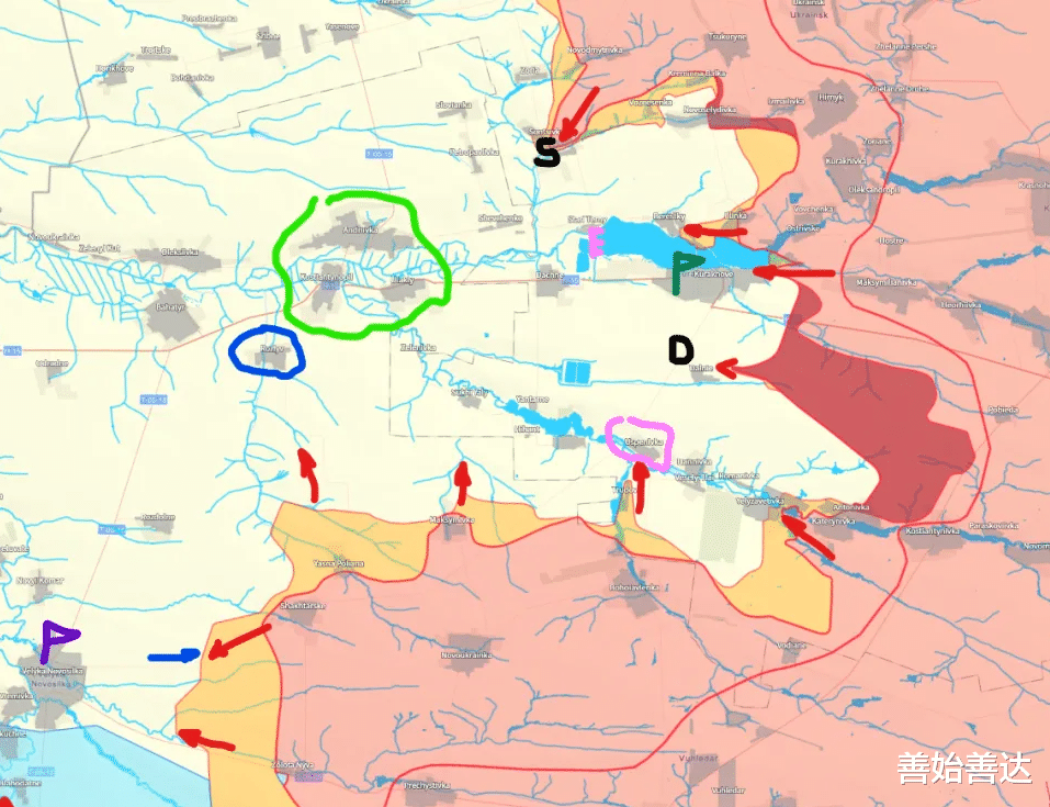 深红色区域为俄军最新进展。从这个进展看,如前两篇分析的,乌军应重兵在S——绿圈——蓝圈——紫旗一线的袋口;俄军继续两翼施压,最终是迫使袋内乌军且战且退的正面平推,知道战线在上述一线拉平。军事技术取得突破前,这场战争静态阵地战的本质不会改变。