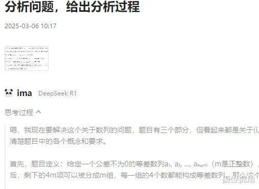 在第二问时,DeepSeek 的表现更有意思,它多次逼近正确结论,但由于在分组时遗漏了一个关键数字,导致解不出来。但如果换作学生在考场上,能有这种持续探索的精神,其实是很可贵的。甚至在过程中,它还会突然“顿悟”——那些“aha moment”让人感觉它真的像是在“思考”,而不仅仅是死算。