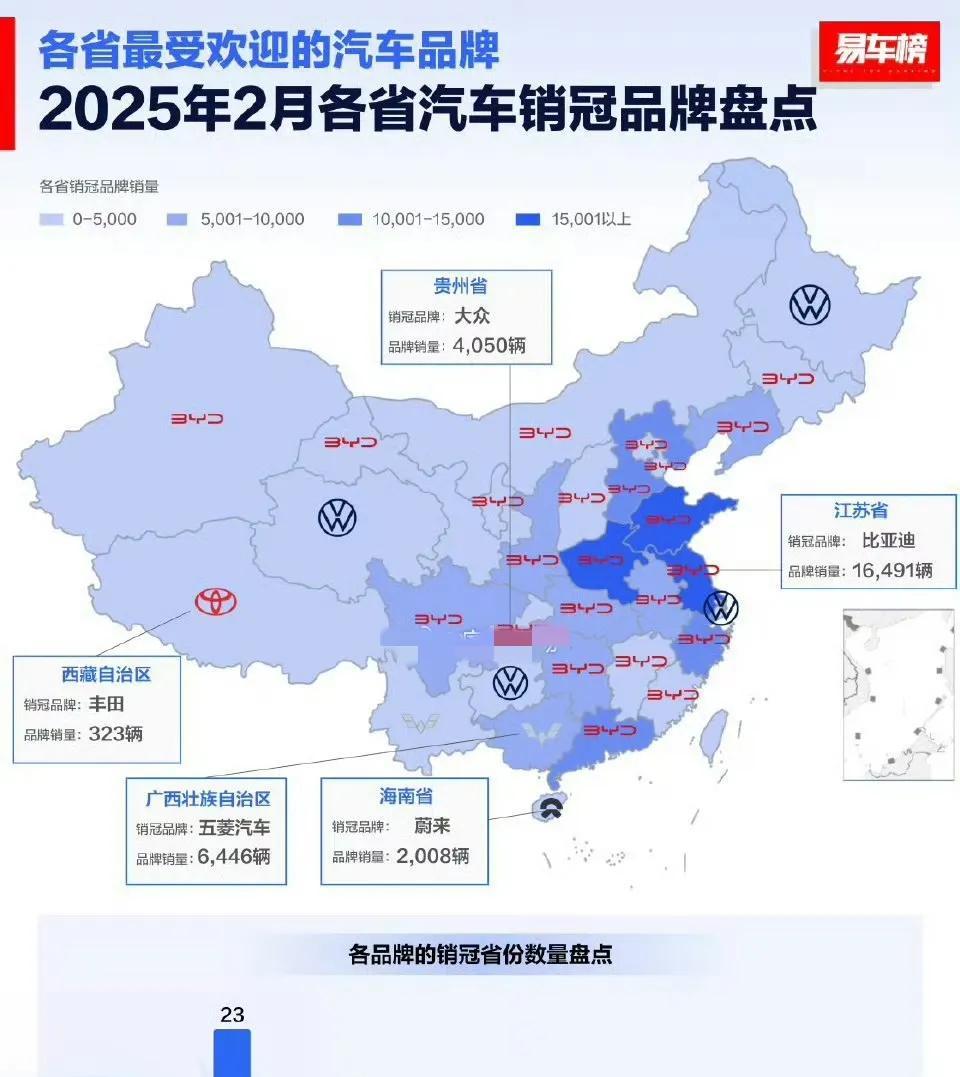 比亚迪,这个名字,在中国汽车市场上几乎已经成为了新能源的代名词。2025年2月,它在23个省份拿下销量冠军,表面上看,这简直是碾压式的胜利。但如果我们深入挖掘数据背后的故事,就会发现,这“23”背后,藏着比亚迪不得不面对的隐忧,甚至,它正在失去一部分曾经牢牢掌控的市场。