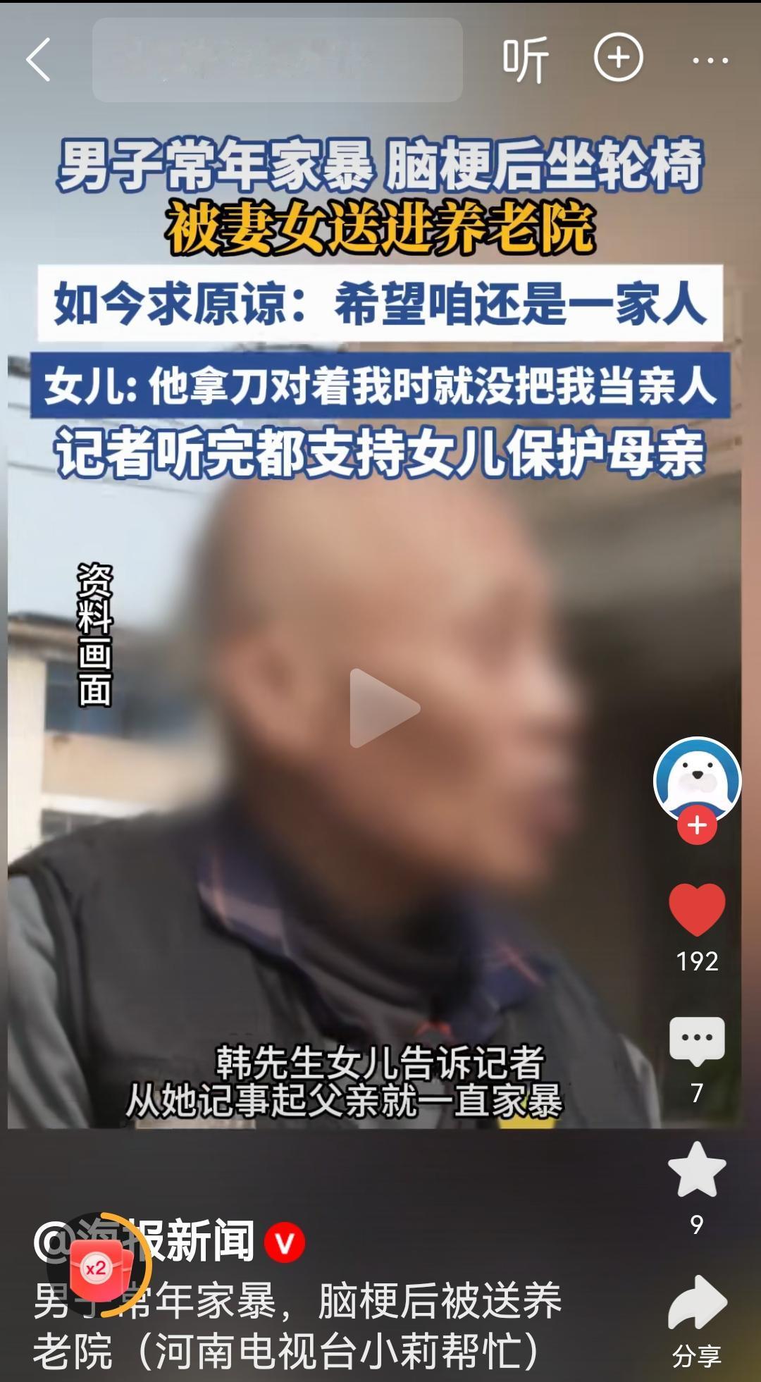 那些年轻时家暴妻女的渣男们看看 这就是你们将来的下场 河南一男子常年家暴妻子,女儿,脑梗后被送入养老院。 现在哭求妻女原谅他,要求妻女接回他照料,被女儿拒绝。