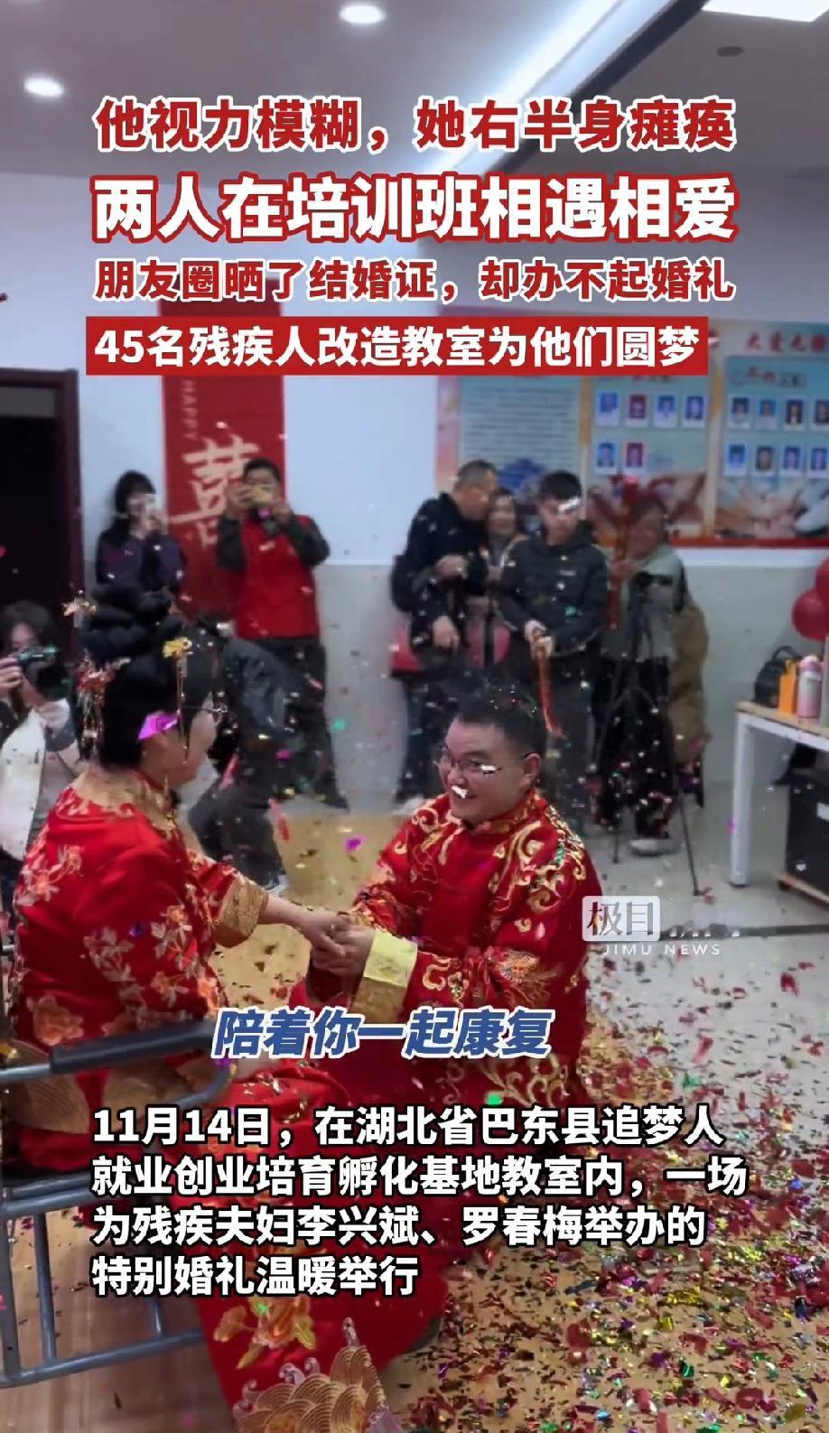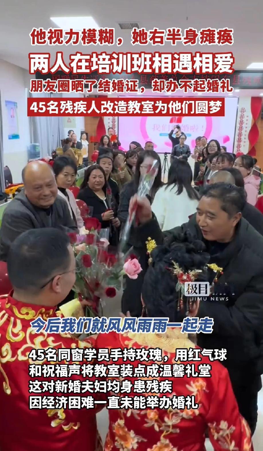 湖北巴东县,一名视力模糊的男子和一名右半身瘫痪的女子在培训班相遇,日复一日的相处,两人逐渐喜欢上彼此,很快,两人就领了结婚证,并在朋友圈晒图。由于经济困难,两人一直没有办婚礼。没想到的是,45名残疾人得知情况后,纷纷出钱出力,把教室改成礼堂为他们圆梦。 (来源:极目新闻) 今年11月14日,湖北巴东县追梦人就业创业培育孵化基地的教室里,一场特别的婚礼让无数人热泪盈眶。 新郎李兴斌视力模糊,看东西总是模模糊糊的,连眼前人的脸庞都得凑很近才能看清;新娘罗春梅右半身瘫痪,走路得靠着拐杖,右手也不太灵活,做不了重活。 谁也没想到,这对命运多舛的人,会在技能培训班里收获爱情,更在45名同窗的帮助下,圆了期待已久的婚礼梦。 故事要从今年的技能培训班说起。李兴斌和罗春梅都是冲着学门手艺来的,一个想靠技术养活自己,一个希望能独立生活少给家人添麻烦。 刚进班时,两人都挺内向,李兴斌因为视力不好,记笔记、看教材都很费劲,常常一个人坐在角落默默努力;罗春梅则因为行动不便,上下课、打水都有些吃力,很少主动和人说话。 有一次上课,李兴斌看不清黑板上的重点,急得满头大汗,罗春梅看在眼里,悄悄把自己记得工工整整的笔记推到他面前,用还能动的左手比划着告诉他哪里是重点。 从那以后,两人就熟络起来了。李兴斌会提前帮罗春梅占好靠近门口的座位,下课时扶着她慢慢走;罗春梅则会帮李兴斌整理笔记、念教材内容,还会提醒他路上的障碍物。 训练场上的相互扶持,让两颗孤独的心慢慢靠近。他们都知道彼此的难处,也懂对方心里的不甘和对美好生活的向往。 李兴斌说,每次看到罗春梅明明行动不便,却还是坚持完成训练,就觉得自己没理由退缩;罗春梅则觉得,李兴斌虽然视力不好,但做事踏实靠谱,总能给她满满的安全感。 相处久了,爱情自然而然地发生了,没有轰轰烈烈的表白,只有日复一日的陪伴和照顾。 今年,两人决定领证结婚。拿到红本本的那天,他们在朋友圈晒出照片,配文简单却满是幸福:“往后余生,相互陪伴。” 可开心过后,两人却犯了难。家里经济条件都不好,李兴斌靠打零工勉强糊口,罗春梅需要长期康复治疗,根本拿不出钱办一场像样的婚礼。 没有婚纱、没有礼堂、没有宾客,这场只领了证的婚姻,成了两人心中小小的遗憾。 没想到,他们的遗憾被培训班的45名同窗看在了眼里。这些同学大多也身患残疾,深知生活的不易,更懂这份爱情的珍贵。 大家悄悄商量,要给这对新人一个惊喜。没有专业的策划,也没有充足的资金,同学们就自己动手: 有人从家里带来红气球,用不太灵活的手一个个吹起来,挂满教室的天花板; 有人凑钱买了玫瑰,每个人都手持一束,准备当见证者;有人擅长手工,用彩纸剪了喜字和爱心,贴满了墙壁和门窗; 残联和妇联的工作人员知道后,也赶来帮忙,布置场地、准备音响,还特意找了人当主持人。 婚礼当天,罗春梅穿着简单的红色外套,由李兴斌小心翼翼地扶着走进教室。 当她看到原本普通的教室被装点得温馨又喜庆,45名同窗笑着向他们挥手,手里还捧着玫瑰时,瞬间红了眼眶。 李兴斌虽然看不清细节,但能感受到现场的热闹和温暖,他紧紧握着罗春梅的手,声音有些哽咽:“我今后努力养家,不让你多操心,陪着你一起康复。” 没有华丽的誓词,却比任何承诺都动人,同学们也都轮流送上祝福。 这场婚礼虽然简陋,却比许多盛大的仪式更有意义。李兴斌和罗春梅的爱情,是困境中的相互取暖,是不向命运低头的勇气;45名同窗的帮助,是同病相怜的共情,是不分你我的善意。 现在很多人觉得结婚离不开彩礼、房车和盛大的婚礼,但其实爱情的本质是陪伴,婚姻的本质是真心。只要两个人心意相通、相互扶持,再加上身边人的善意与祝福,就算条件简陋,也能拥有满满的幸福。