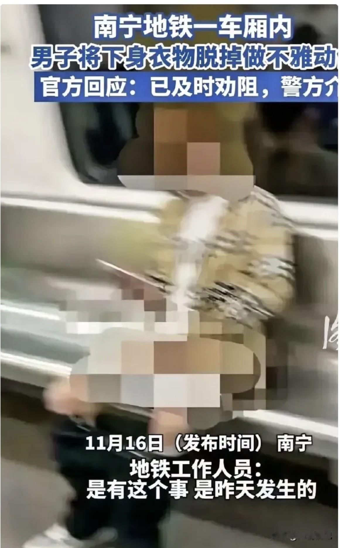 南宁一男子在地铁座椅脱掉裤子当众做不雅动作!已被行政拘留! 家人们,今天这瓜,真是又辣眼睛又让人唏嘘!主角就是咱们南宁的这位“掏鸟哥”。 事情就发生在11月15号晚上9点左右,正是地铁上人多的时候。这位老兄,据说是喝了点“黄汤”,在车厢里直接坐到椅子上,然后……就把裤子给脱了开始做不雅动作!我的天,现场画面想想都让人捂眼!周围的乘客估计都惊呆了,这大庭广众的,是把地铁当自己家客厅了吗? 好在地铁工作人员反应快,第一时间过来劝阻,但这位“酒壮怂人胆”,根本不听,最后只能交给地铁公安。警察叔叔效率也高,当晚就把他控制住了,直接带回派出所“醒酒”兼调查。 第二天(11月16号),警方就火速通报了:行政拘留!没毛病,这行为太恶劣了,严重破坏公共秩序,影响极其不好,尤其还有小孩在场,简直没法忍。 现在网上都炸锅了,大家都叫他“掏鸟哥”。网友们都说,这下可真是“社死”了,全网都知道了。你说你,喝点酒就管不住自己了?酒品差,人品更差!这哪是冲动,这分明是平时就没把公序良俗放眼里,酒后只是原形毕露罢了。 这代价也太大了!拘留所里蹲几天是肯定的,工作估计也悬了,哪个公司敢要这种员工?名声臭了,家人朋友也跟着丢脸。真是应了那句话:“出来混,迟早要还的!” 这事儿也给大家提了个醒,喝酒可以,但千万别失了分寸。公共场合,你的自由是有边界的,不能影响到别人。成年人了,得为自己的行为负全责!别等后悔都来不及了,才想起“早知今日,何必当初”呢!