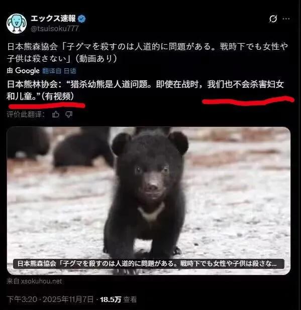 日本熊林协会:“猎杀幼熊是人道问题。即使在战时,我们也不会杀害妇女和儿童。”是有多厚颜无耻,才能睁眼说瞎话! 如果翻译没问题,按这话的理解是:我们不会猎杀幼熊的,因为我们甚至连妇女和小孩都不会杀。他们真是太“善良”了!