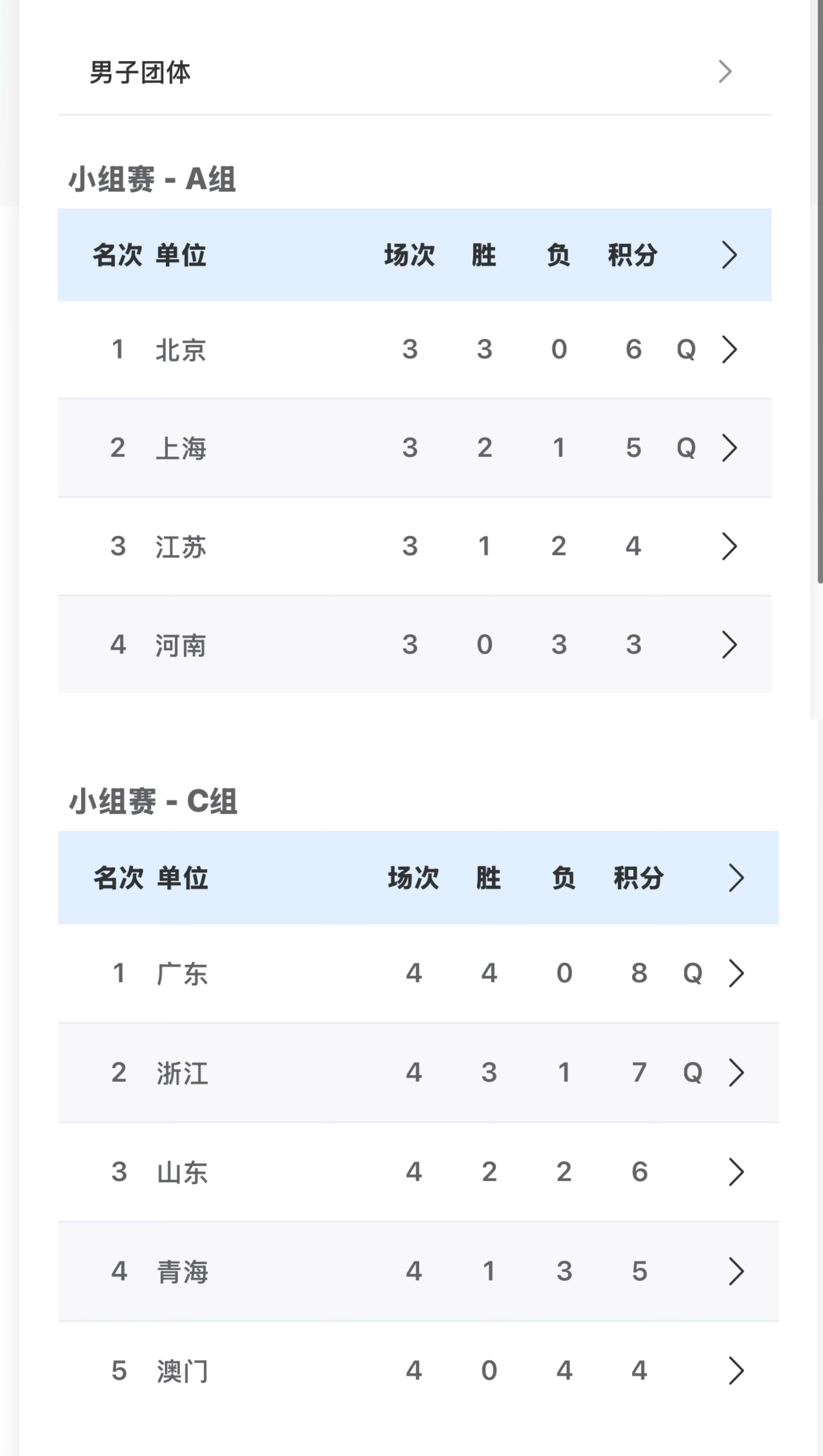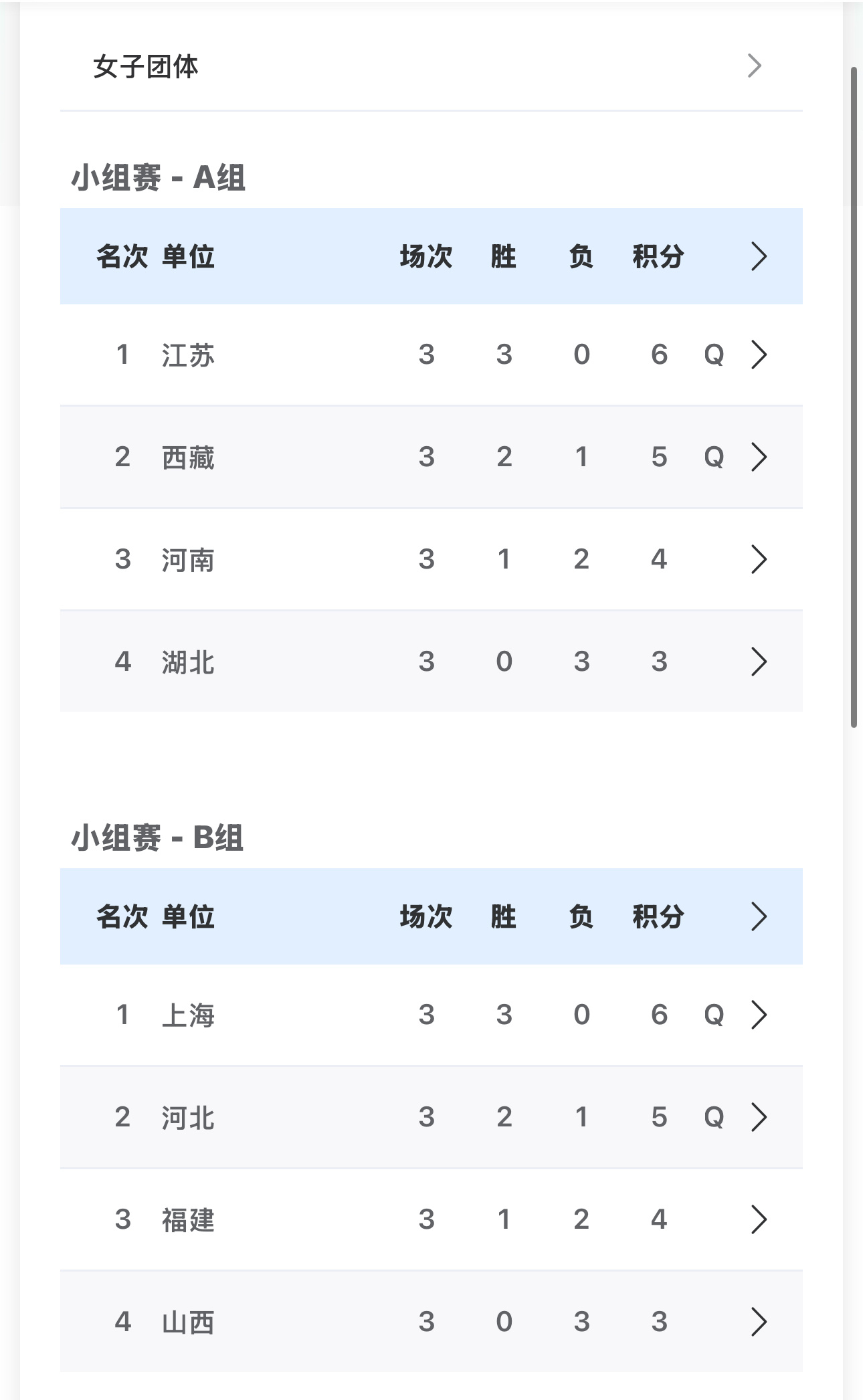 2025大湾区全运会男子团体出线A组 北京(1)上海(2)C组 广东(1)浙江(2)女子团体出线A组 江苏(1) 西藏(2)B组 上海(1)河北(2)今晚18:00进行男女团体最后一轮小组赛淘汰赛抽签时 每小组第一和第二不会进入同一半区