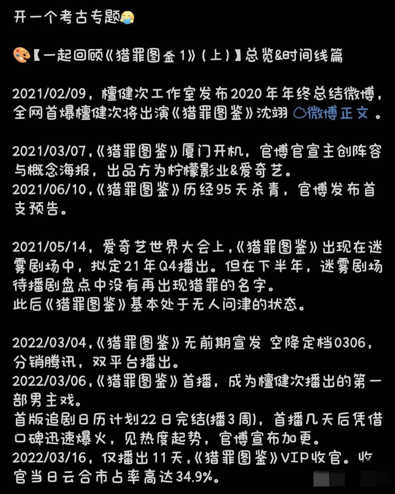今天朋友给我推荐一部剧,说她刚刚发现了一部宝藏剧,熬了三个通宵看完了,剧情很新鲜,关键是男主角的气质很干净,有种书卷气的斯文帅气,就特别有分享欲,然后疯狂向我安利,一问她剧名原来我早就看了好几遍了!是的,这部剧就是《猎罪图鉴》! 刑侦剧演警察,很容易成为背景板,毕竟看点在案件和刺激的探案过程,人物特点突出的一般在嫌疑人!沈翊的初始人设还蛮单薄的,人人都知道刑侦重剧本,但没人能腆着脸说随便来个人都能演活沈翊! 再者猎罪图鉴是原创IP,沈翊是原创角色 没有所谓的书粉原著粉加成,却能达到连续两季都是爆剧水平,含金量可以说是相当的高,沈翊的塑造是剧集成功的关键因素,檀健次硬是靠演技和颜值爆成大流量! 说实话说在大部分演员连抠书式演技都做不到的情况下,檀健次把原创角色塑造出圈,把剧集推进到连续两季甚至还有第三季的IP,是很不容易的!谁都记得当年檀健次在dy跳了一个月的比山高半山腰! 猎罪图鉴1真黑马剧,开播前无人看好,首日播放量300多万,次日2000万多翻了近7倍,这还是在没什么营销的情况下。11天播完,单日播放量最高9400,基本就是更新日一天涨1000的水平,那个曲线真是一路上扬,要是没被删4集大概率能破亿的! 并且猎罪图鉴的后劲也特别猛,开播的时间不长,但是长尾效应非常明显,不同时间都有入坑的人! 沈翊的火是全方位的,比如有人提画像,下面就会提沈翊。其他的剧办案,也会有人找沈翊。所有人都知道刑侦界天才画像师沈翊的存在,沈翊真的穿插在各个悬疑剧的弹幕里! 记得看过一个投票相柳和沈翊谁是白月光?那可是轻松破亿的相柳啊,一千多人投票,白月光竟是沈翊。我也觉得沈翊很完美,只是没想到票数差这么多。能打败檀健次相柳的,果然还只能是他自己创造出来的角色! 檀健次的沈翊,可以放肆爱、无限刷,我觉得檀健次是目前比较少有的实力和流量并线发展的演员。基本补全了檀健次饰演的角色,真心欣赏他每一次突破的勇气以及高标准的能力。