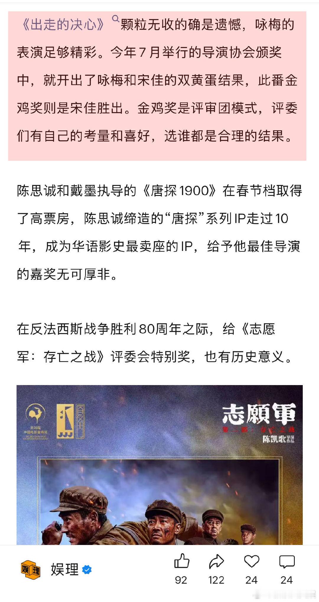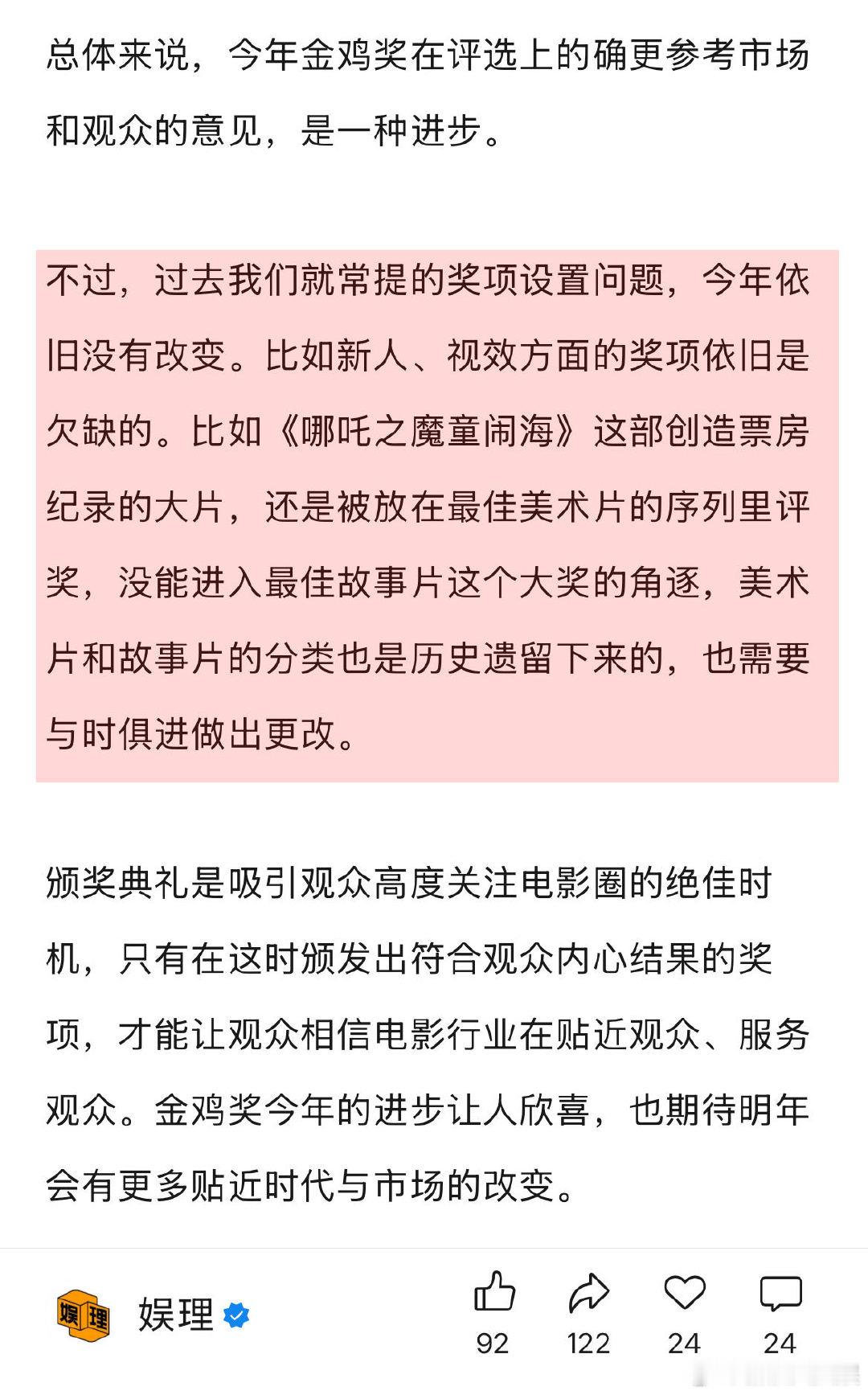 今年金鸡奖在评选上的确更参考市场和观众的意见,是一种进步。但是过去常提的奖项设置问题,今年依旧没有改变。比如新人、视效方面的奖项依旧是欠缺的。比如《哪吒之魔童闹海》这部创造票房纪录的大片,还是被放在最佳美术片的序列里评奖,没能进入最佳故事片这个大奖的角逐,美术片和故事片的分类也是历史遗留下来的,也需要与时俱进做出更改…↓