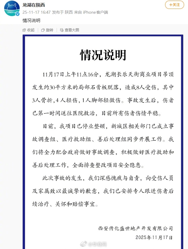 【龙湖长乐天街吊顶脱落事故情况说明】 发布情况说明:11月17日上午11点16分,龙湖长乐天街商业项目吊顶发生约30平方米的局部石膏板脱落,造成8人受伤,其中3人骨折,4人轻伤,1人脚部轻微伤。事故发生后,伤者已第一时间送往医院救治,目前所有伤者伤情平稳。目前,我项目已停业整顿,新城区相关部门已成立事故调查组、医疗救助组、善后处理组同步开展工作。我们将全力配合政府做好事故调查,积极做好医疗救助和善后处理工作,全面排查整改项目安全隐患。此次事故的发生,我们深感愧疚与自责,向受伤人员及家属致以最诚挚的歉意,我们已安排专人跟进伤者后续治疗、关怀和赔偿事宜。