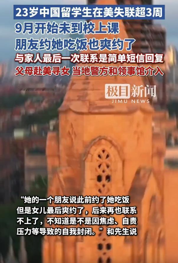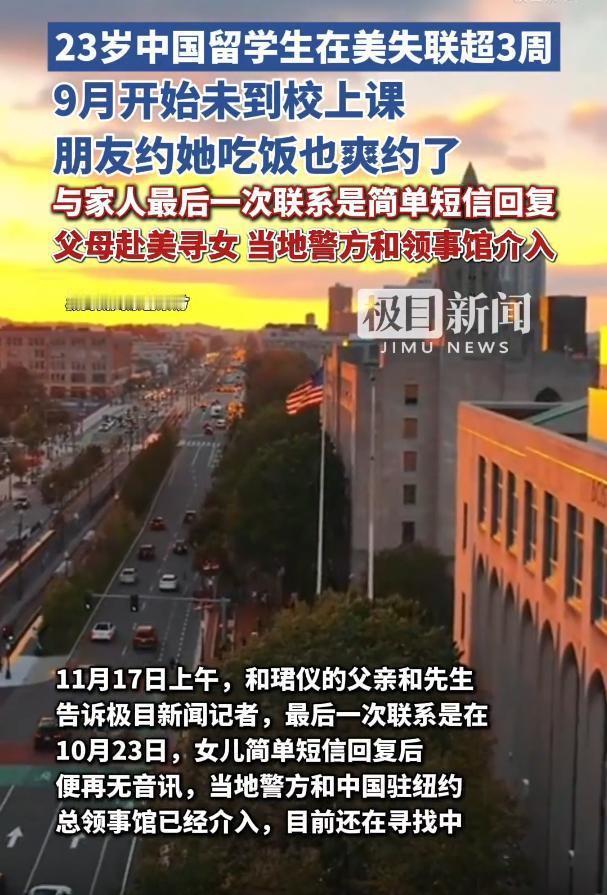 名校留学生失联,父母跨国寻女,太让人揪心了! 事情起因是,23岁的留校生在今年10月最后一次回复家人短信后就在美国彻底失联,电话和微信都联系不上,信用卡的消费记录也无法追踪到踪迹。其父母心急如焚直接冲到美国寻找,可是面对陌生的环境和语言不通等问题,得到的线索十分渺茫,寻找的历程充满煎熬。 由衷希望这对父母能尽早找到自己的孩子,孩子都是父母的珍宝。在海外留学不仅仅有机遇和知识,也有挑战和危险。希望广大留校生在外也能注意安全。 留学生 社会百态
