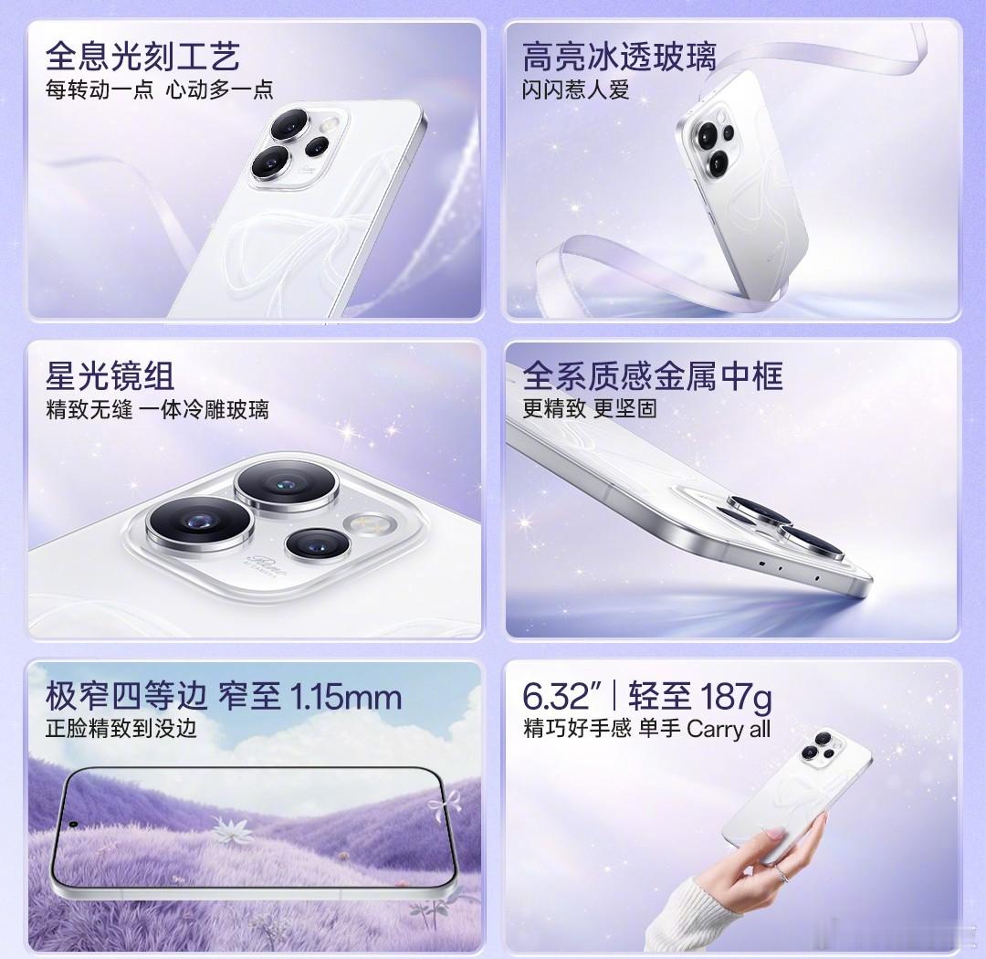 Reno15系列配色:星光蝴蝶结,极光蓝,可露丽棕,蜜糖金。全系金属中框,6.32英寸直屏,1.15mm四等边,重量187g。