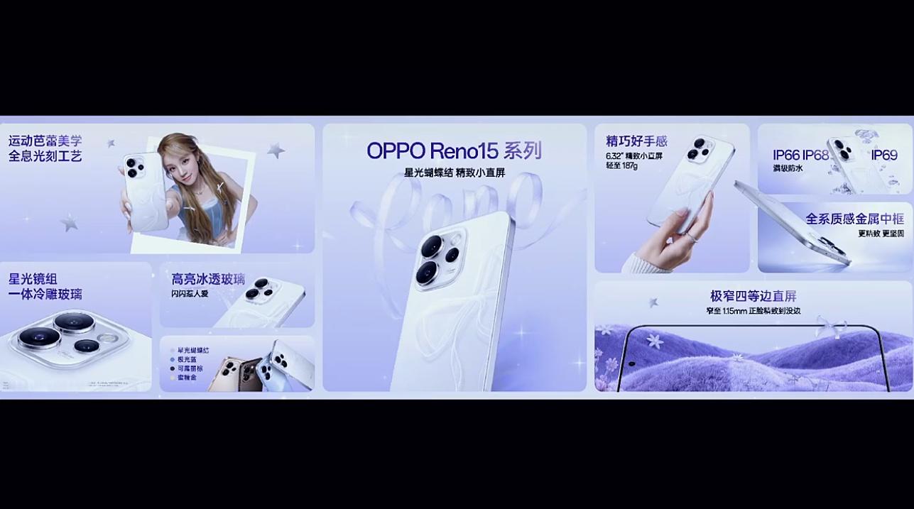 OPPO Reno15系列焕新登场,以「精致小直屏」设计诠释轻薄手感。全系搭载质感金属中框,Reno15 机身仅重187g,6.32英寸屏幕单手轻松握持。背盖采用一体冷雕玻璃工艺,星光镜组精致无接缝,推出四款灵感配色:「星光蝴蝶结」以裸眼3D与闪光砂镀膜还原星河璀璨;「极光蓝」叠加工艺呈现极光流动;「可露丽棕」融汇法式复古浪漫;「蜜糖金」自带暖调优雅气场。