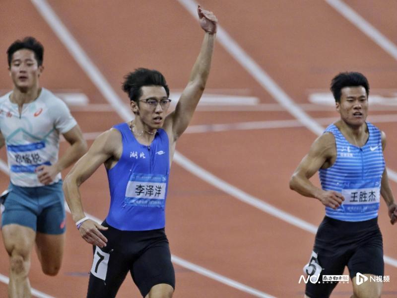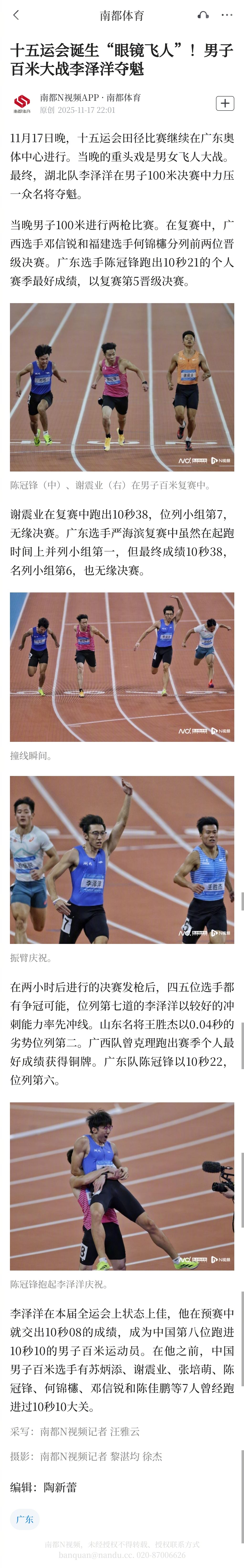 【十五运会诞生“眼镜飞人”!】11月17日晚,十五运会田径比赛继续在广东奥体中心进行。当晚的重头戏是男女飞人大战。最终,湖北队李泽洋在男子100米决赛中力压一众名将夺魁。当晚男子100米进行两枪比赛。在复赛中,广西选手邓信锐和福建选手何锦櫶分列前两位晋级决赛。广东选手陈冠锋跑出10秒21的个人赛季最好成绩,以复赛第5晋级决赛。谢震业在复赛中跑出10秒38,位列小组第7,无缘决赛。广东选手严海滨复赛中虽然在起跑时间上并列小组第一,但最终成绩10秒38,名列小组第6,也无缘决赛。在两小时后进行的决赛发枪后,四五位选手都有争冠可能,位列第七道的李泽洋以较好的冲刺能力率先冲线。山东名将王胜杰以0.04秒的劣势位列第二。广西队曾克理跑出赛季个人最好成绩获得铜牌。广东队陈冠锋以10秒22,位列第六。李泽洋在本届全运会上状态上佳,他在预赛中就交出10秒08的成绩,成为中国第八位跑进10秒10的男子百米运动员。在他之前,中国男子百米选手有苏炳添、谢震业、张培萌、陈冠锋、何锦櫶、邓信锐和陈佳鹏等7人曾经跑进过10秒10大关。