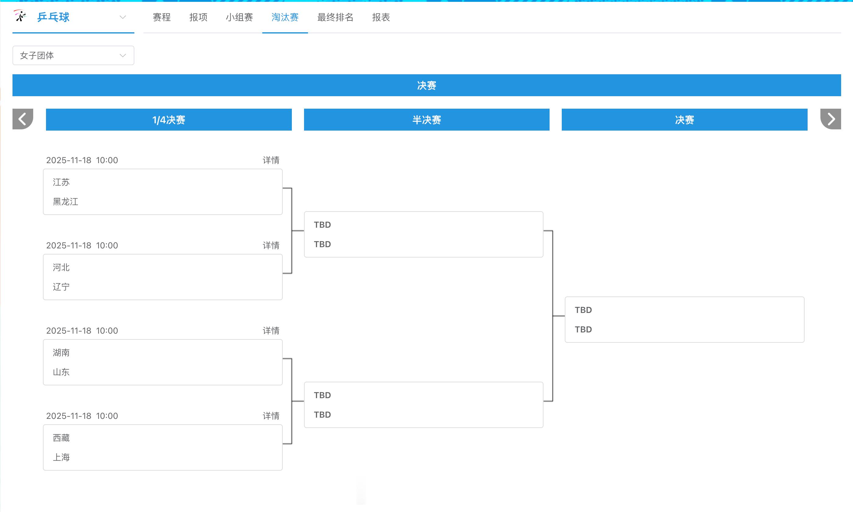 十五运会乒乓球比赛男女团体已产生八强,淘汰赛阶段对阵如下——女团 1/4决赛(上半区)江苏vs黑龙江;河北vs辽宁(下半区)湖南vs山东;西藏vs上海男团1/4决赛(上半区)北京vs辽宁;天津vs广东(下半区)河北vs上海;浙江vs黑龙江男女团1/4决赛将于11月18日10时举行,18时将展开半决赛的争夺。