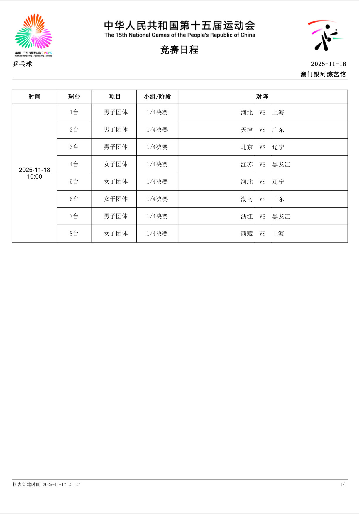 乒乓球项目11月18日赛程10:00男、女团1/4决赛18:00男、女团半决