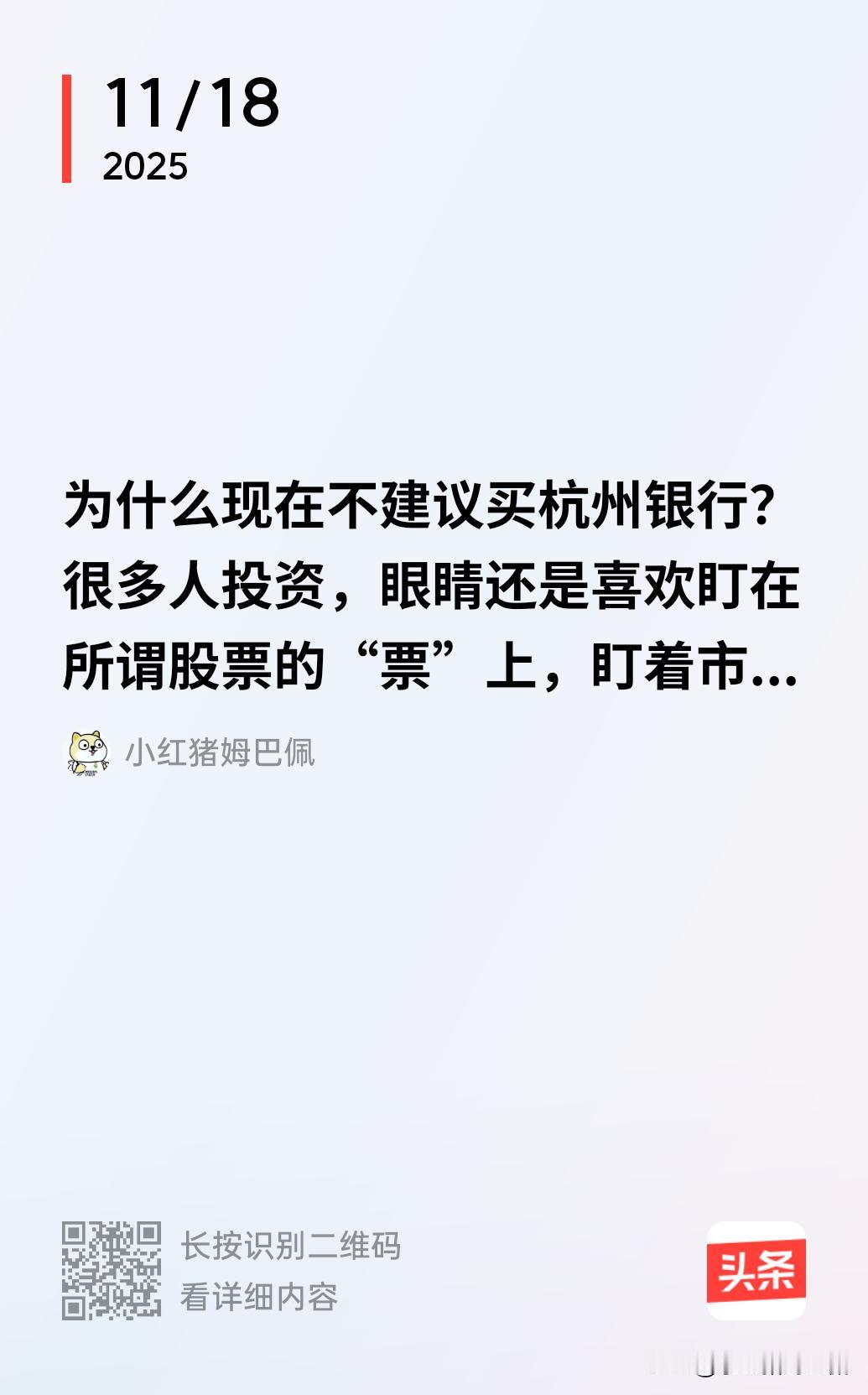 基于什么考虑,我在前期29元出头会抛完宁波银行? 一方面,本来这些都是战术仓位,不是战略仓位,并不打算持有5~10年,因为当下5-10年维度显然有更好的标的。那么,在三季报发布后,我将宁波银行的短期合理估值,从25-30元调整到26-31元后,在26.8左右建立的仓位过了29我就会逐步出了。我从不考虑买最低和卖最高,鱼头鱼尾总要让点给市场里的别人吃。 另一方面,配置战术性仓位,除了考虑公司本身外,还要考虑市场结构和同业情况。就像我上次所说的,目前行业的龙头农业银行显然已经高估,如果这里是农业银行的中期顶部,即使宁波杭州这样的城商行本身值得买,也会被影响波及到。除了考虑行业大哥外,还要考虑同在浙江省的城商行老二杭州银行,可以参考我为何不建议当下买杭州的那篇(其实这也是目前业内部分机构的看法),你的大哥高估了,你的小弟又走得很惨,只是一个科技的看跌期权,那短期你的空间就被掣肘在此的概率很大了。