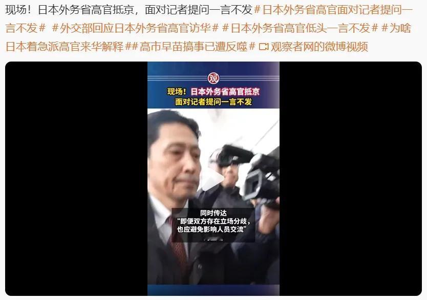 日本外务省官员抵达中国,中方无人接机,现场冷冷清清。面对记者的提问,此人始终一言不发。 他肯定什么也不敢说,他这次来是准备替高市早苗背锅的,心里肯定很不爽,这是其一。其二他知道来采访他的记者提的问题都是非常不好回答的,所以纯粹啥也不讲,这是最正确的做法。 从中方的态度来看,已经很明显,此人这次来中国,基本上不会有什么作用。祸不是他惹的,他没有必要来解释什么,他来解释中方也不会听。话是高市早苗说的,要解释要收回也得高市早苗本人,其他人没有资格来代替她。如果连这点她都做不到,派再多的人来中国都不会有什么作用,不如节省两个差旅费。 中国嘞态度现在已经很明确了,那就是如果高市早苗不出面,不收回自己说过的话,不承认自己的错误,那就什么都没得谈。接下来,日本就等着被收拾吧。