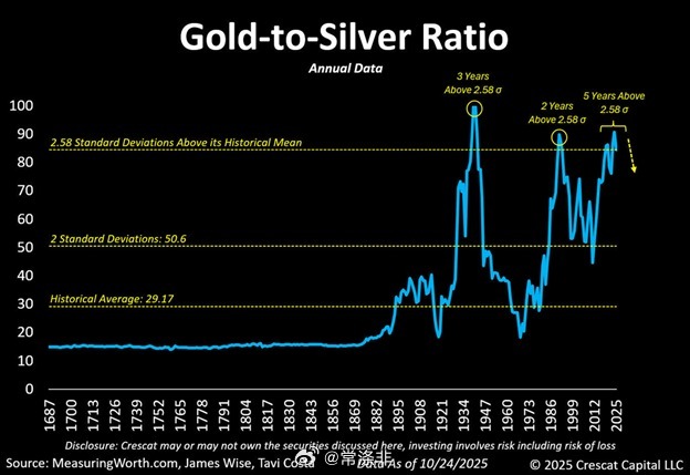 【】 尽管白银价格出现了历史性上涨, 但看起来仍然相对便宜: 目前金银比价年化值已超过 80 点,接近 20 世纪 80 年代以来的最高水平。 据Crescat Capital称,这比其长期历史平均值高出约 2.58 个标准差。 自 2020 年以来, 该比率已连续约 5 年高于此 阈值。 相比之下,20 世纪 30 年代和 80 年代分别为 3年和2年。 简而言之, 白银相对于黄金而言, 仍然处于历 史低位。 历史经验表明, 白银可能很快就会赶上黄金。