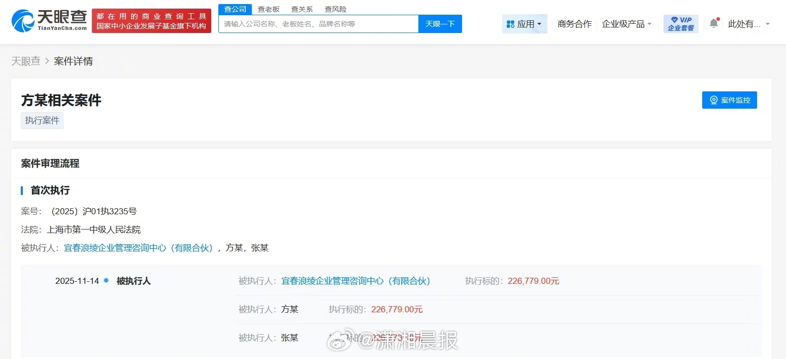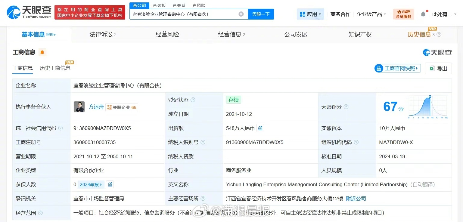 查询天眼查天眼风险信息发现,近日,方运舟、张勇、宜春浪绫企业管理咨询中心(有限合伙)新增两则被执行人信息,执行标的合计36.5万余元,执行法院为上海市第一中级人民法院。宜春浪绫企业管理咨询中心(有限合伙)成立于2021年10月,执行事务合伙人为方运舟,出资额548万人民币,经营范围为社会经济咨询服务、信息咨询服务。合伙人信息显示,该咨询中心由方运舟、张勇等40余位合伙人共同出资。