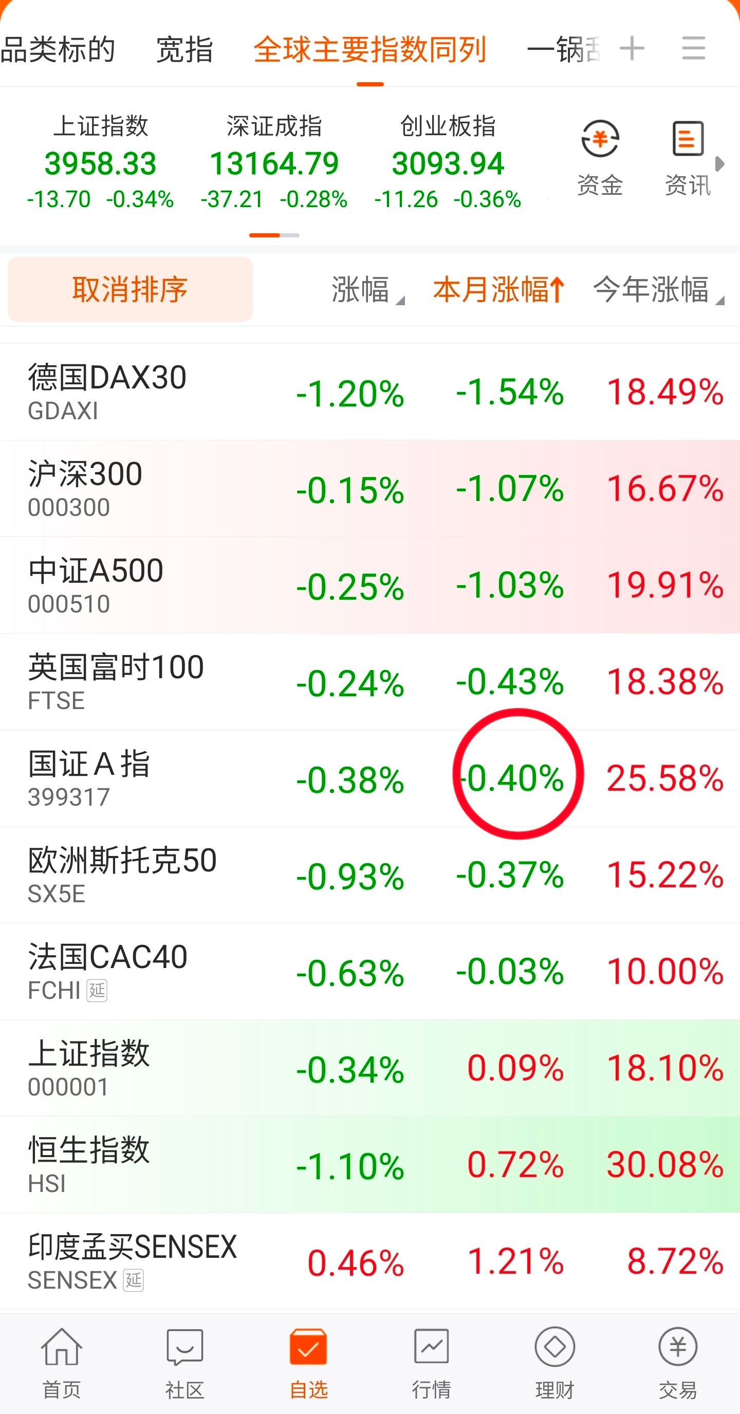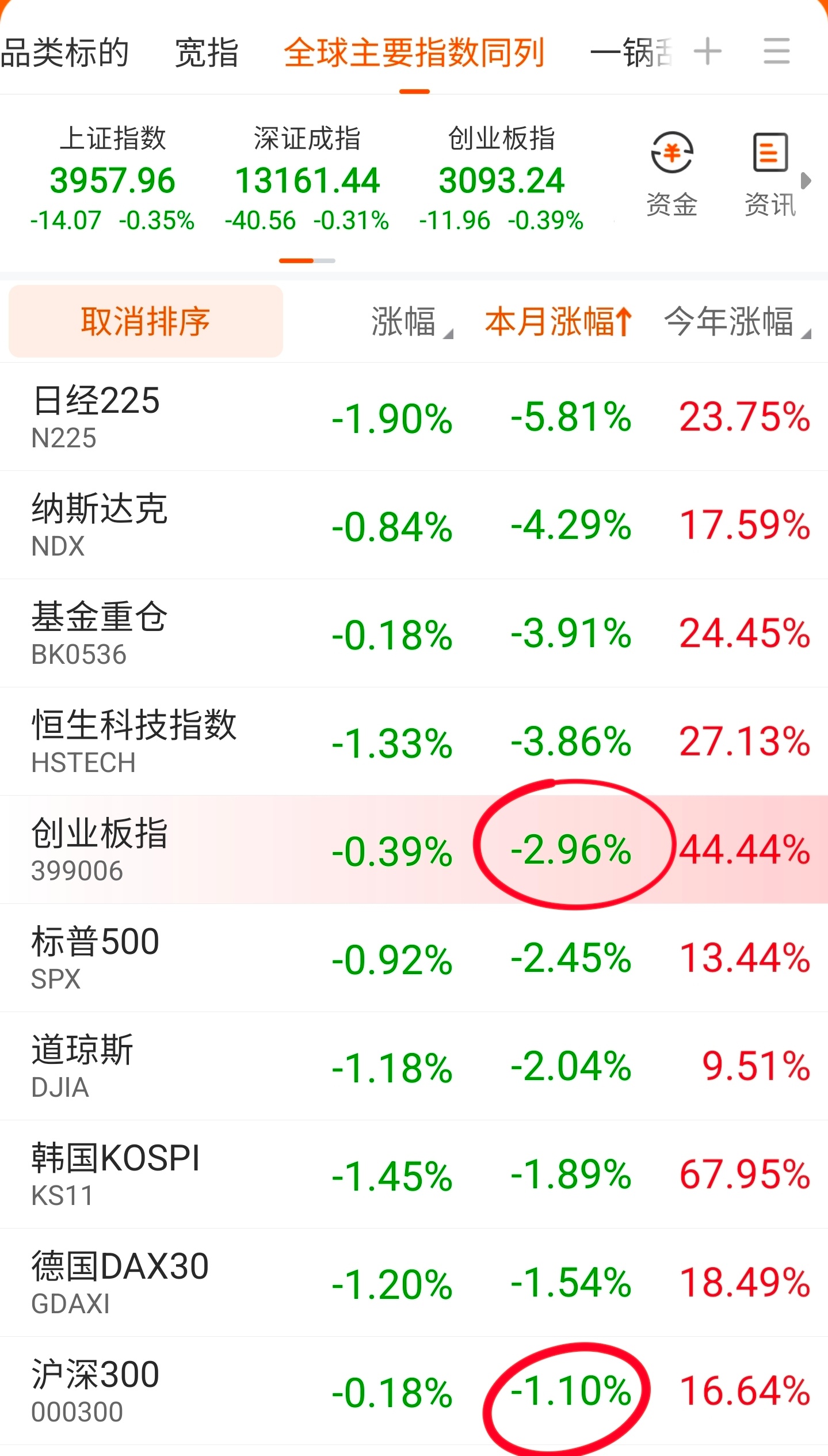 国证a指早盘低开,11月来涨幅再次跌尽。目前基金重仓:-4%,创业板:-3%,沪深300:-1%日经:-5.8%,纳指:-4.2%,标普500:-2.4%11月基本都绿了,又进入回本模式。