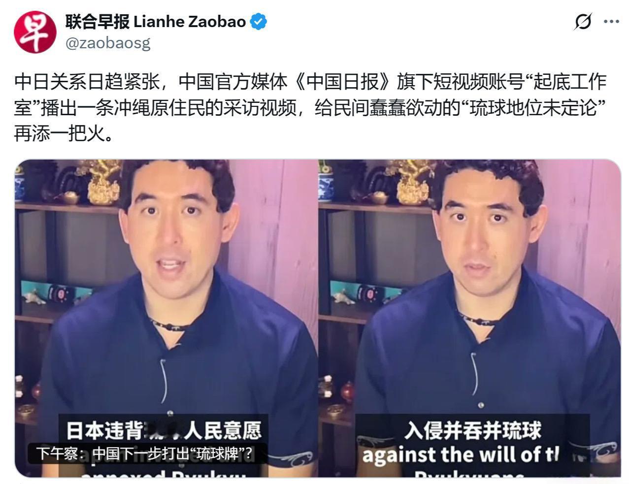 联合早报:中日关系日趋紧张,中国官方媒体《中国日报》旗下短视频账号“起底工作室”播出一条冲绳原住民的采访视频,给民间蠢蠢欲动的“琉球地位未定论”再添一把火。 做得好!让世界看到琉球,让世界人民了解琉球王国的历史,了解琉球王国人民曾经被日本人屠杀、领土被非法侵占的历史,不仅是追求独立复国的琉球人民的责任,也是中国人,尤其是中国媒体的责任。 当然了,还可以有“让世界看见夏威夷”、“让世界看见苏格兰”、“让世界看见科西嘉”、“让世界看见魁北克”......。