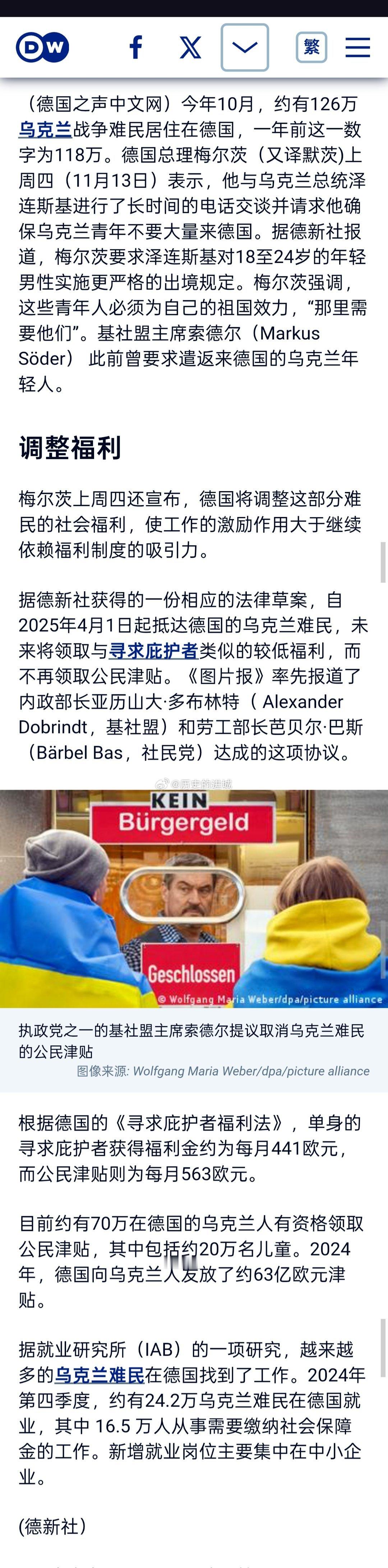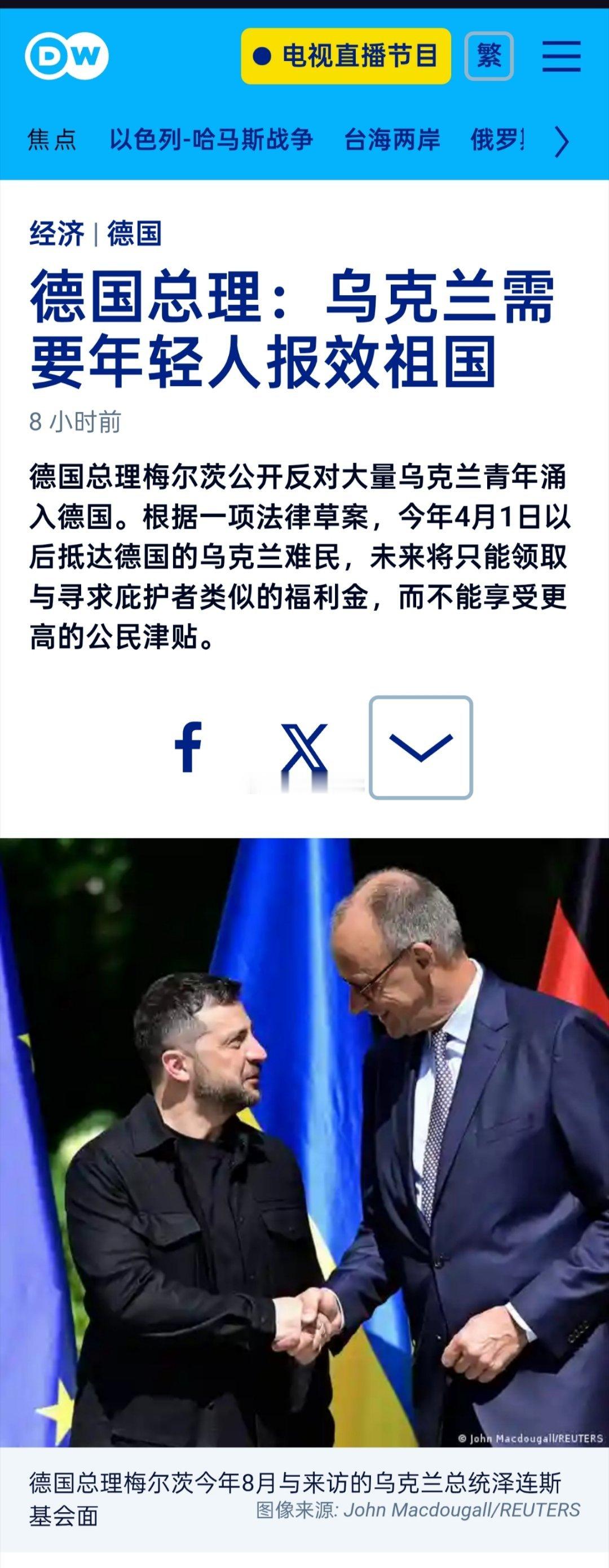 截至今年10月,约有126万乌克兰战争难民居住在德国。德国总理默茨上周四(11月13日)表示,他与乌克兰总统泽连斯基进行了长时间的电话交谈并请求他确保乌克兰青年不要大量来德国。据报道,默茨要求泽连斯基对18至24岁的年轻男性实施更严格的出境规定。默茨强调,这些青年人必须为自己的祖国效力,“那里需要他们”。德国基社盟主席索德尔此前曾要求遣返来德国的乌克兰年轻人。