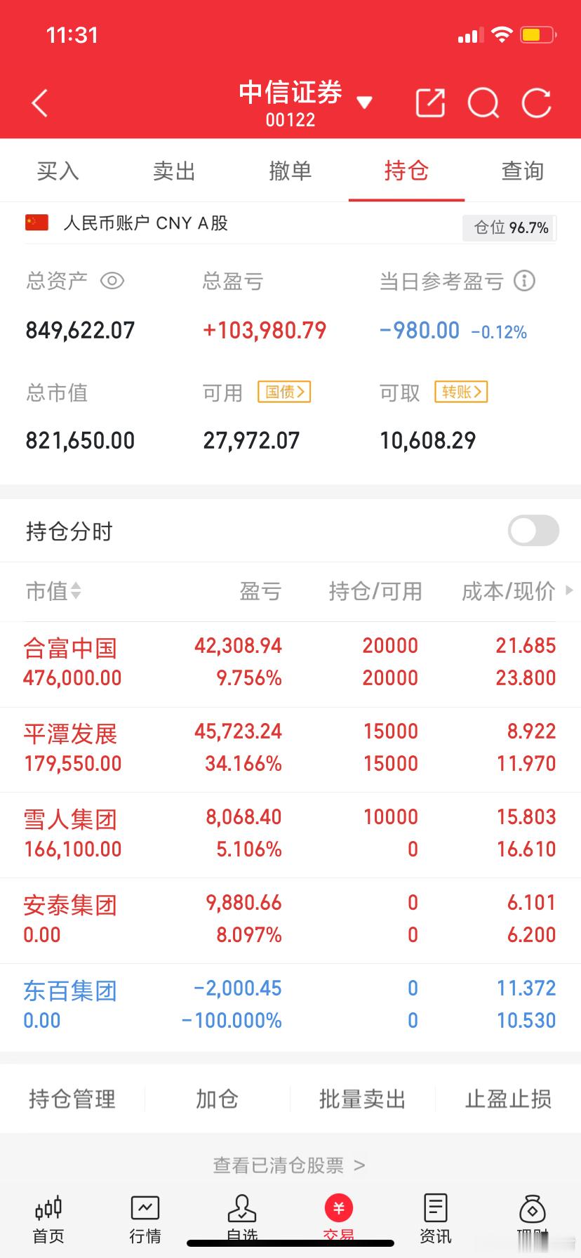 阿城实盘,今天最新操作记录:今日卖出: 安泰集团 东百集团今日上车: 雪人集团今日持仓: 平潭发展(关小黑屋) 合富中国(关小黑屋) 特别声明:我开实盘的目的主要是为了记录我对A股走势的思考和研判,并用于记录我自己的操作笔记,是我积累股票投资知识和反省操作失误的一个平台,绝不是读者朋友买卖股票的依据和理由,不具备投资建议,据此操作,需自行承担投资后果,股市有风险,投资需谨慎