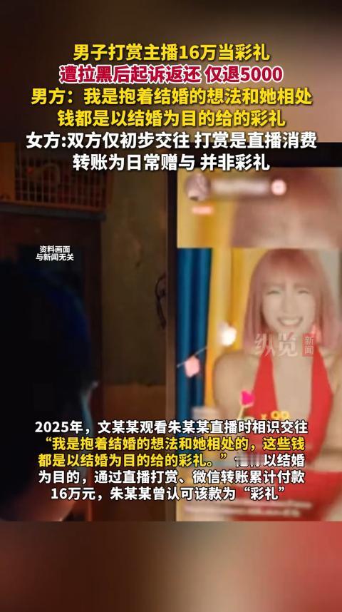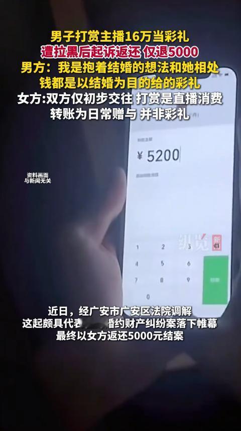 “冤不冤?”2025年,四川广安,一男子刷直播时,被一名漂亮的女主播所吸引,随后对女主播展开了激烈追求,期间,男子通过打赏、转账累计给女子16万元,以此作为“彩礼”,可女子收到后却将男子拉黑!法院审判后,要求女子返还5000元。 现在互联网非常发达,网络上充斥着各种信息,有些人甚至靠直播就能养家糊口,但并非亲眼所见的东西都不能轻易相信,所以大家网络交友时一定要慎重! 有一天,文先生观看直播时,被直播间内的女主播朱某所吸引,他在直播间内大量打赏,最终添加上了对方的联系方式。 在后续的交往中,文先生几乎对朱某言听计从,并表达了想要和对方结婚的意愿,之后更是通过打赏、转账等方式,给朱某转了16万元,表示这就是彩礼。 可朱某在收到钱后却将文先生拉黑,并不认为这属于彩礼。 文先生多次要求朱某退钱,可是屡屡被对方拒绝,没有办法,他只能寄希望于法律,于是将资料递交给了法院。 最终经法院的调解,朱某同意退还文先生5000元,案件最终落下帷幕。 网友看后表示,大家都是成年人,要为自己的行为负责,是不是彩礼并不能只听一面之词,当时如果备注好转账的原因,就不会有这么多麻烦事了! 信息来源:《男子打赏女主播16万后被拉黑》海报新闻