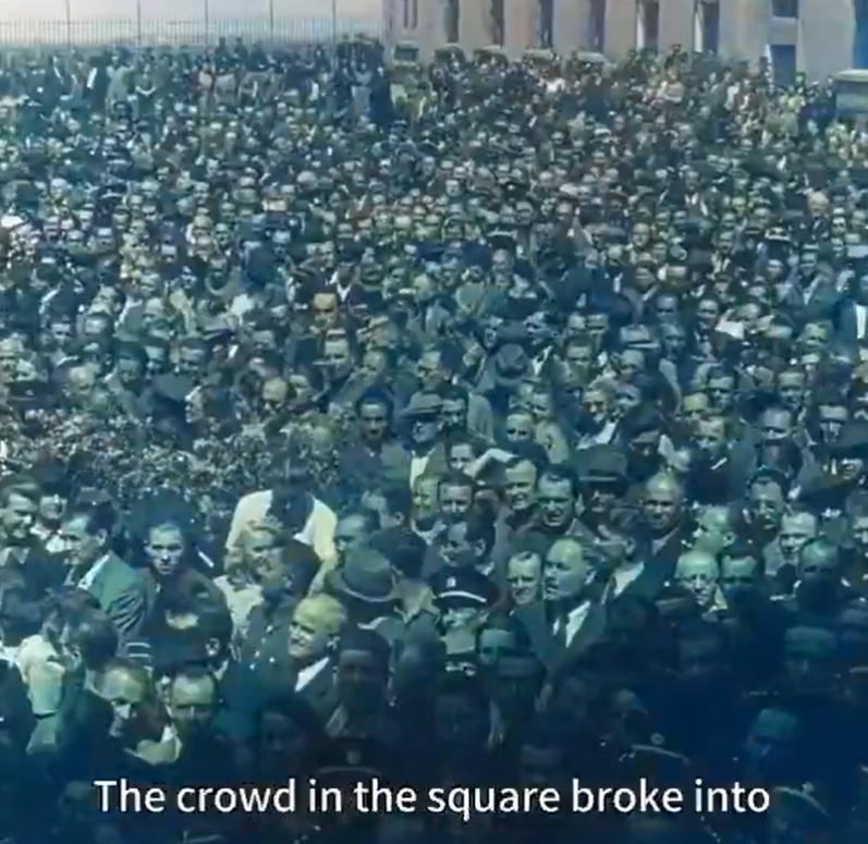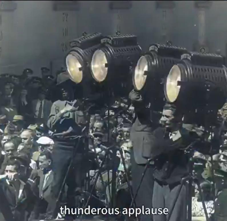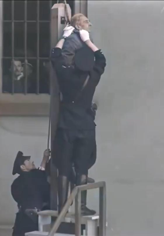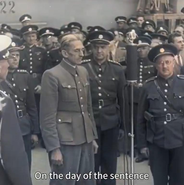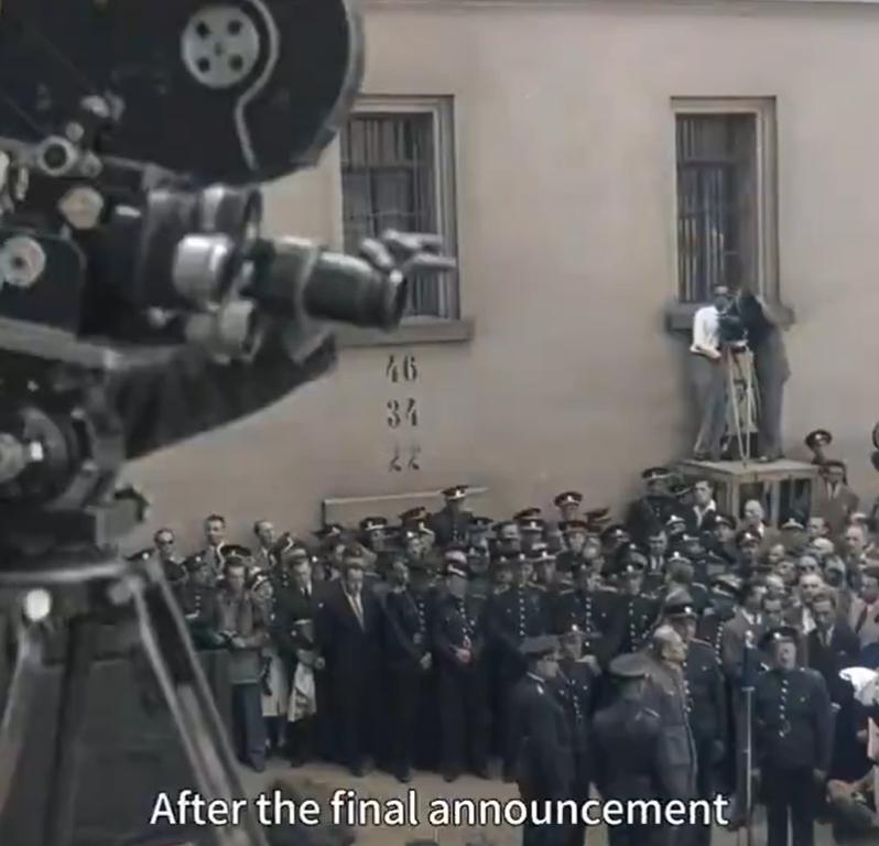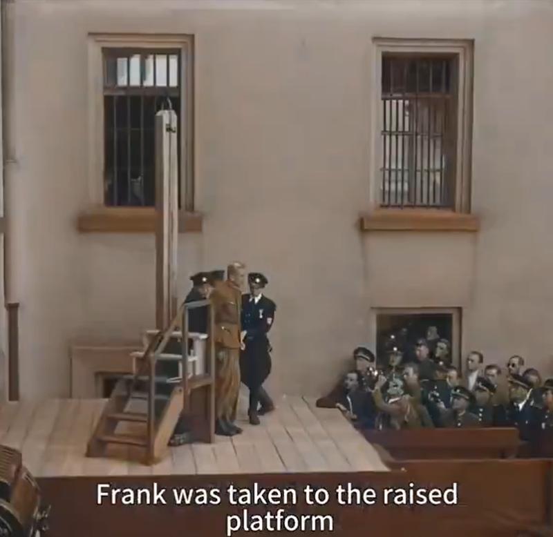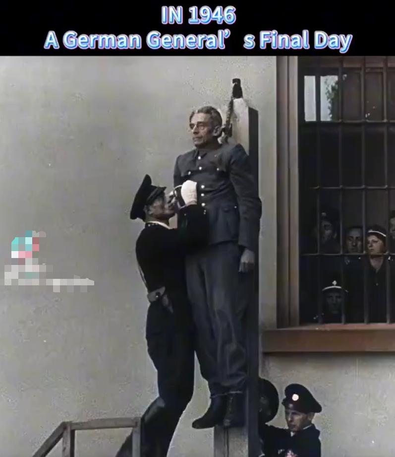 这是纳粹德国人卡尔·赫尔曼·弗兰克(Karl Hermann Frank)在布拉格被处决的瞬间。弗兰克来自苏台德地区,他被控在德国占领捷克斯洛伐克期间,在利迪策和莱扎基对捷克人犯下屠杀罪行。幸存者们旁听了他的绞刑,而他毫无悔意。(1946年5月)
