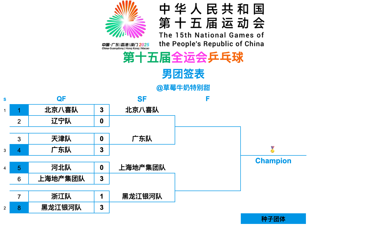 第十五届全国运动会丨男团四强北京八喜队🆚广东队上海地产集团队🆚黑龙江银河队