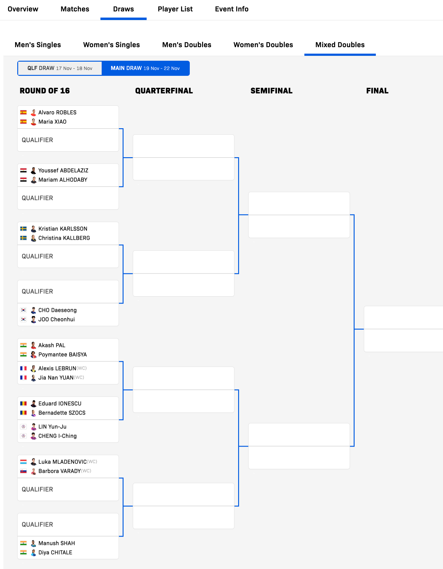 WTT球星挑战赛马斯喀特站丨混双正赛签表【1/4区】罗伯勒斯/肖瑶茜🇪🇸vs Q、阿齐兹/阿尔霍达比🇪🇬vsQ【2/4区】卡尔森/C·卡尔伯格🇸🇪vsQ、Qvs赵大成/朱芊曦🇰🇷【3/4区】帕尔/拜西亚🇮🇳vsA·勒布伦/袁嘉楠🇫🇷、E·约内斯库/斯佐科斯🇷🇴VS林昀儒/郑怡静(中国台北)【4/4区】姆拉德诺维奇🇱🇺/瓦拉迪🇸🇰vsQ、Qvs玛纳什·沙/奇塔莱🇮🇳