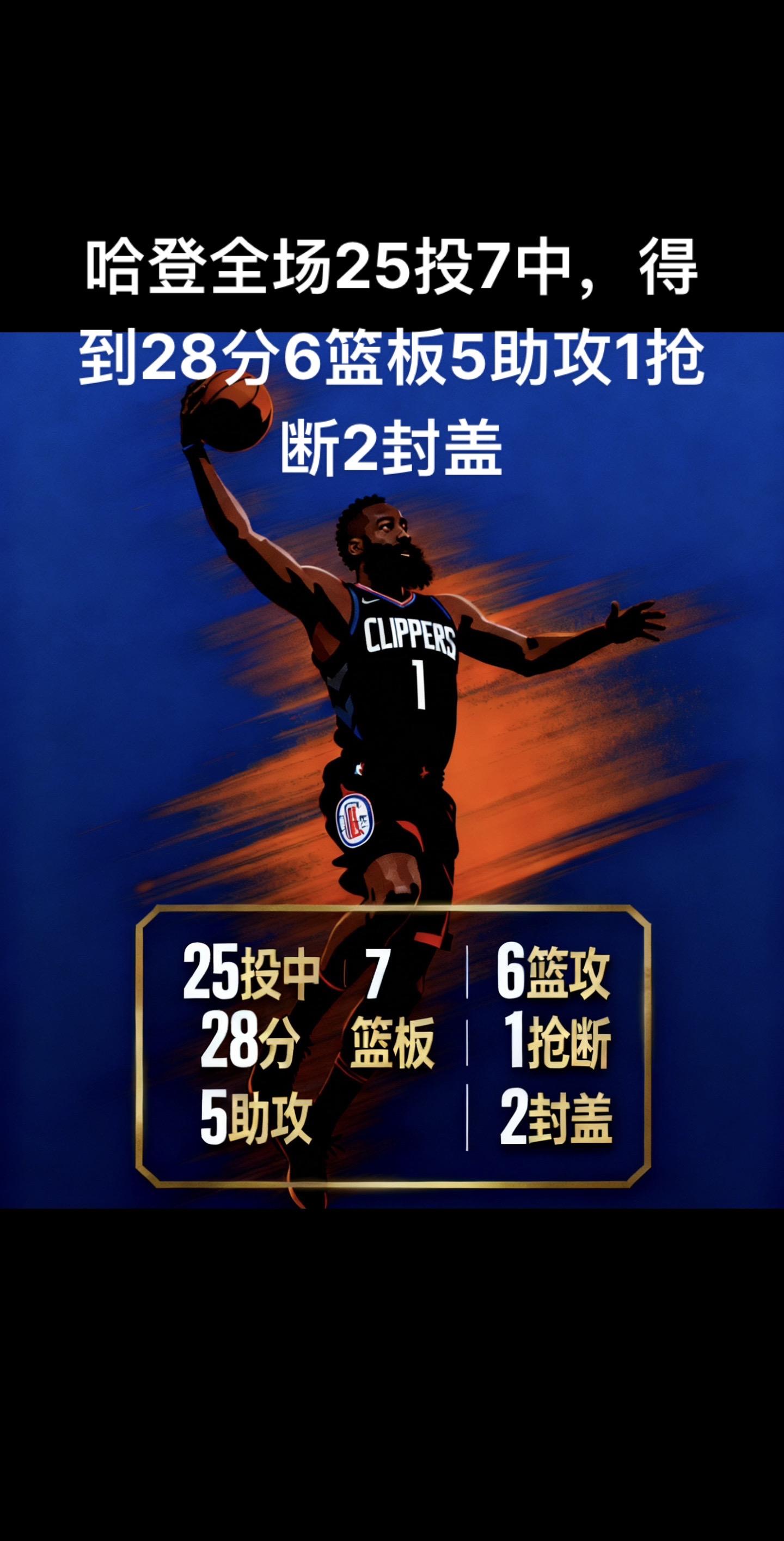 这场11月18日快船108 - 110不敌76人的比赛中,哈登出战约37分钟,除了25投7中,他的三分球12投2中,还凭借12罚全中的完美表现拿到28分,同时收获6篮板5助攻1抢断2封盖,且此战解锁了常规赛生涯28000分的里程碑,成为NBA史上第11位达成该成就的球员。不过他最后时刻连续两记绝杀三分不中,没能帮助球队逆转比赛。哈登篮球76人战胜快船来nbamrd先生