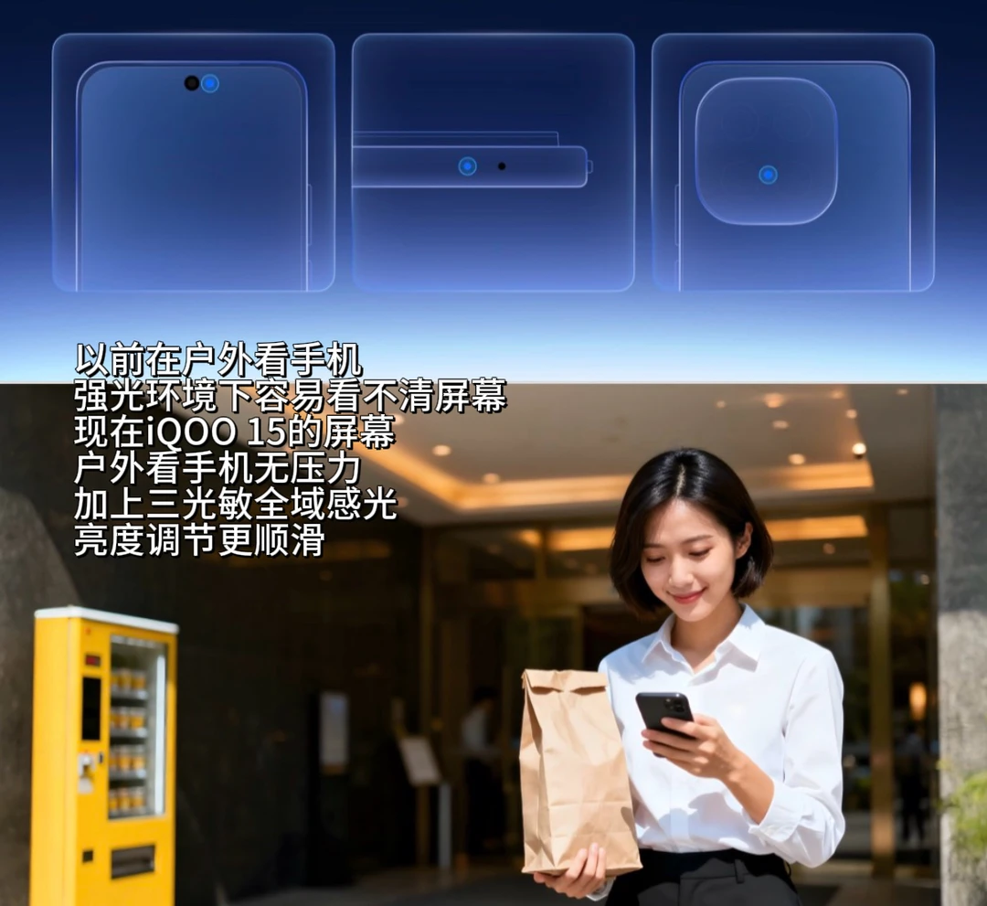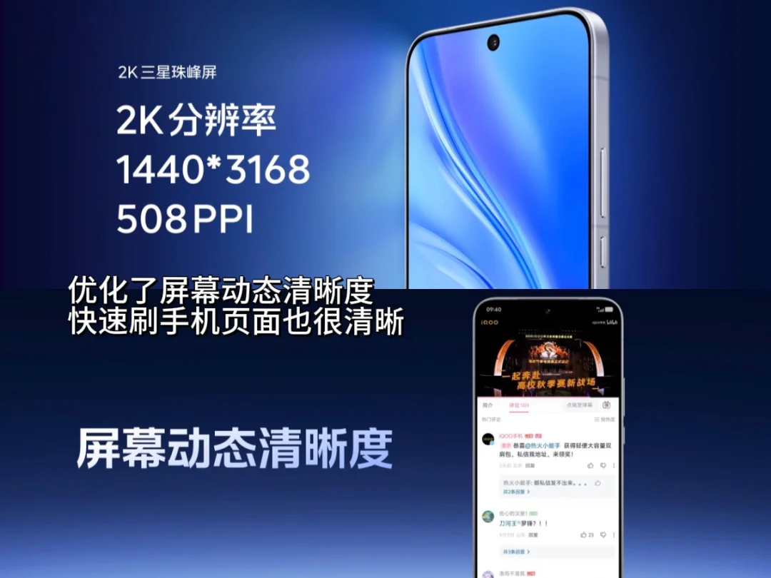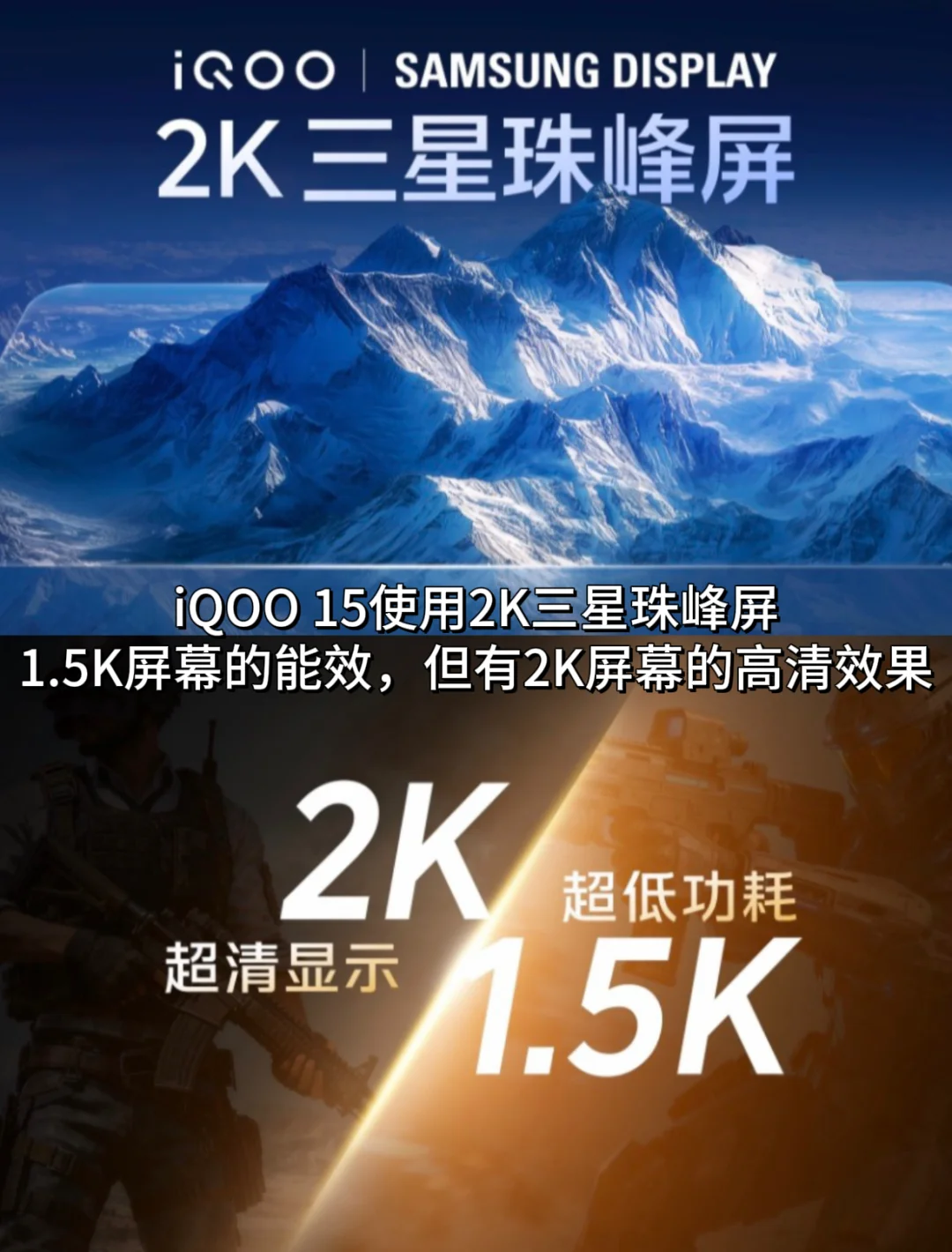 被iQOO 15的屏幕狠狠惊艳到了??\n作为每天刷手机8h?的重度用户\niQOO 15屏幕的每一点升级都有狠狠戳中我\n2K三星珠峰屏\n?得益于2K LEAD OLED显示技术,iQOO 15无论是功耗、色彩、亮度、护眼上都有很大提升\n.\n1??观感表现\n??真2K分辨率对比1.5K屏具备实打实的画面精细度优势\n??配合最低1nit亮度显示和1000nits的手动峰值与2600nits的全屏峰值亮度\n??以及去偏光技术的加持,让iQOO 15的2K三星珠峰屏实现怎么看都清晰的显示效果\n.\n2??功耗控制\niQOO 15得益于去掉“偏光层”的屏幕设计\n以及旗舰新发光材料M14的加持\n??既带来了“一眼通透”的屏幕显示效果,还让面板功耗相较上代下降44%\n??既做到有2K屏的高清显示,又有1.5K屏的超低功耗\n亮度表现\n??同时iQOO 15还带来三光敏全域感光\n不用担心复杂环境下的光线变化,让手机在\"黑屏\"与“爆亮”之间反复横跳了\n??保证了屏幕的高可读性,怎么看都清晰\n回消息毫无压力,户外党狂喜??\n.\n3??护眼功能\n??硬件级自然光显示的无偏振护眼\n??1nit极低亮度护眼\n晚上刷手机也不会很刺眼\n??全新硬件级游戏护眼?悦目护眼2.0\n长时间打游戏,眼睛也不酸胀\n很适合重度手机用户\n.\n?除此之外\niQOO 15还搭载了全新自研电竞芯片Q3\n拥有全场景光追?游戏超分?游戏超帧的独显芯片\n游戏视效?屏幕观感双顶的综合体验,怎么说\n很期待新机上手后\n这块屏幕?性能\n带来的游戏体验\n.\n??能把分辨率、刷新率、护眼和功耗平衡得这么好的\niQOO 15应该是独一份\n追求顶级屏幕体验的宝子\n即将发布的这波新机\n真的可以考虑一下??\niQOO数码新品抢先看一起聊数码数码街区由我造iQOO 15手机推荐新机爆料数码大玩家学生党必备游戏手机iQOO 15这次屏幕你心动了吗 [投票]