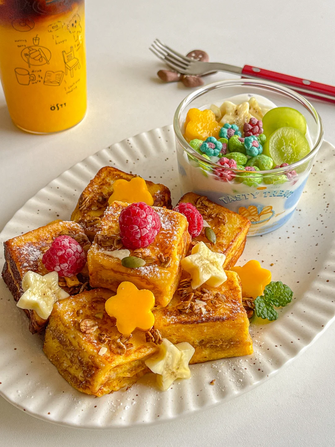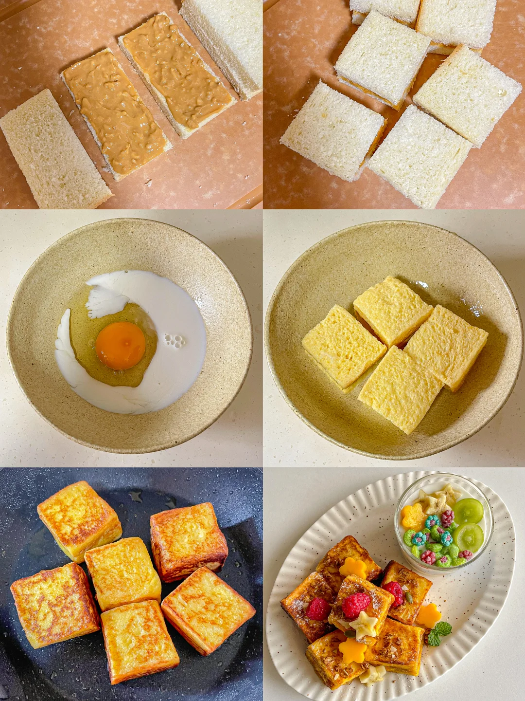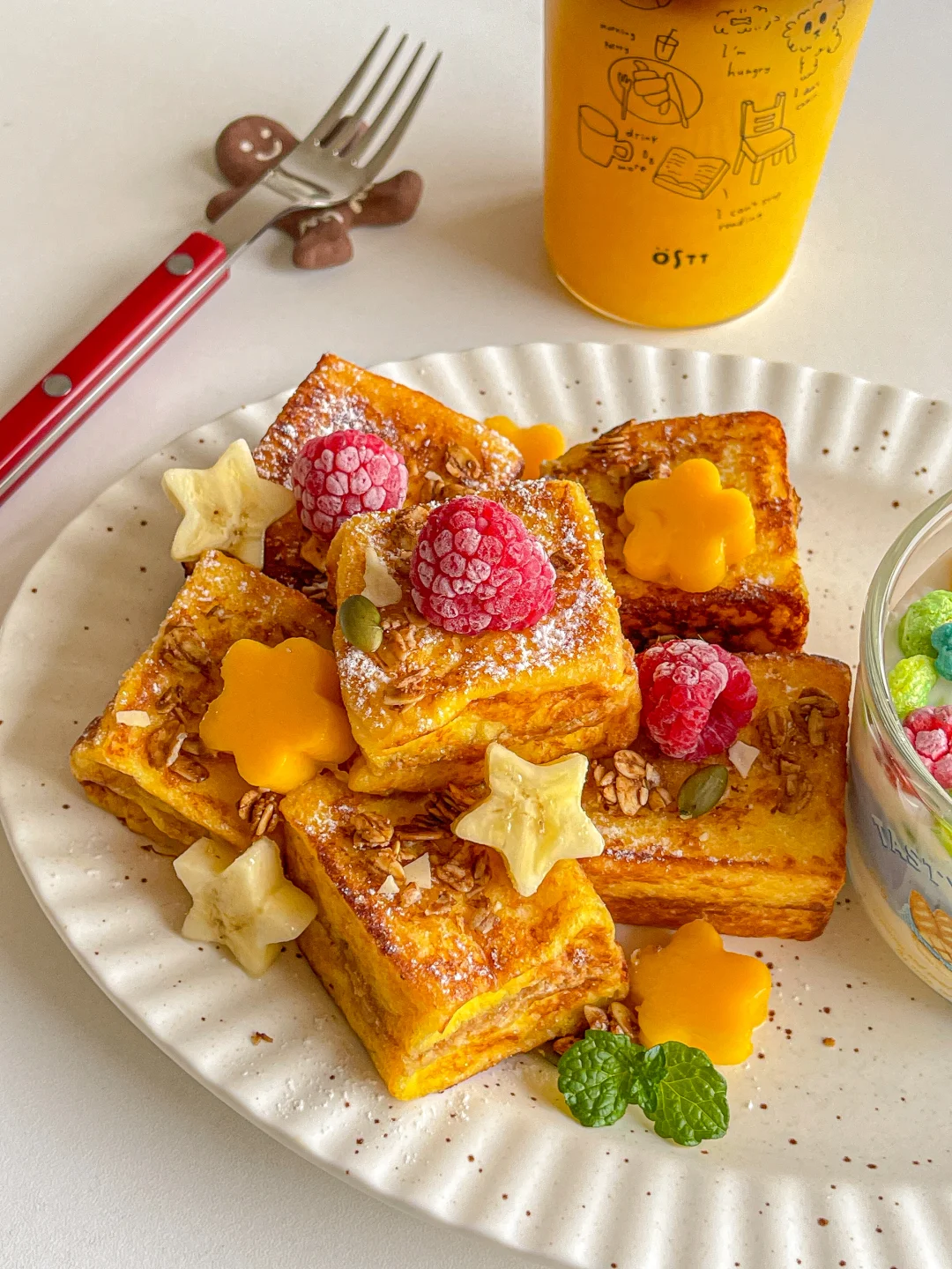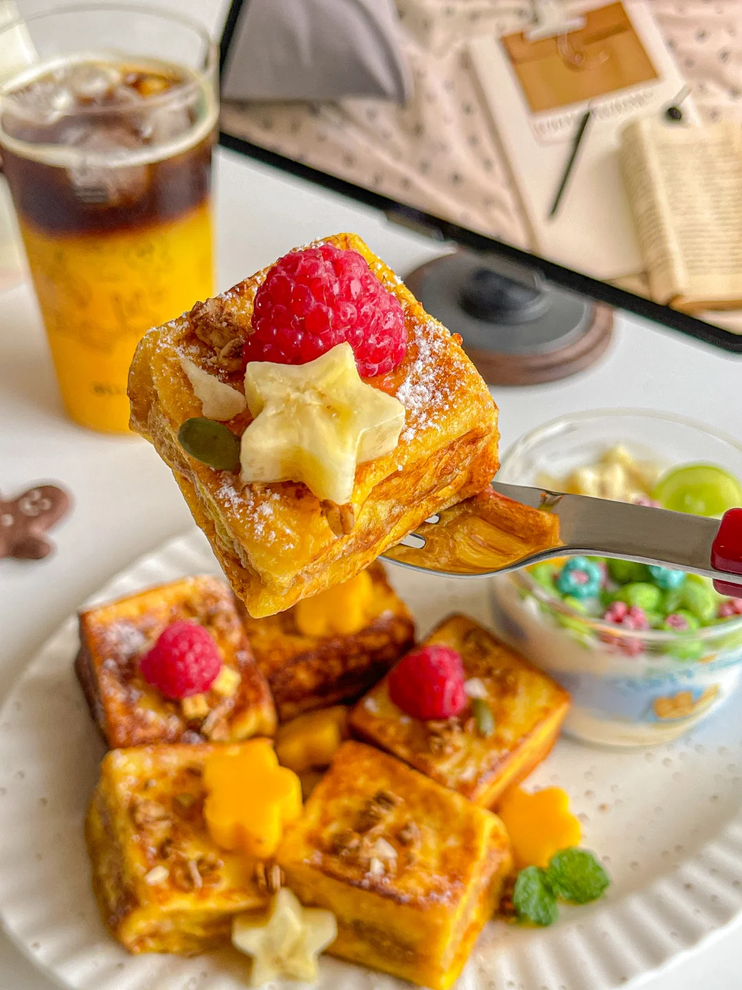 好喜欢今天的早午餐🍌 做法简单 好看又好吃[亲一个R] 食材:🍞 吐司➕花生酱➕鸡蛋➕牛奶➕枫糖浆➕希腊酸奶➕芒果➕香蕉➕树莓➕青提➕麦片 步骤:🥣 1.吐司去边 涂抹上花生酱 切成四份 2.鸡蛋加入适量的牛奶 枫糖浆 搅拌均匀 3.把吐司放在蛋液里面浸泡 再用黄油煎至金黄 4.装盘后放上喜欢的水果 撒上一层薄薄的糖粉即可 怎么回事!每年一到秋冬就会想吃西多士🍞黄油煎一下巨香 搭配水果 撒上糖粉 淡淡的甜味 刚刚好!经典的早餐就是不会出错[派对R]
