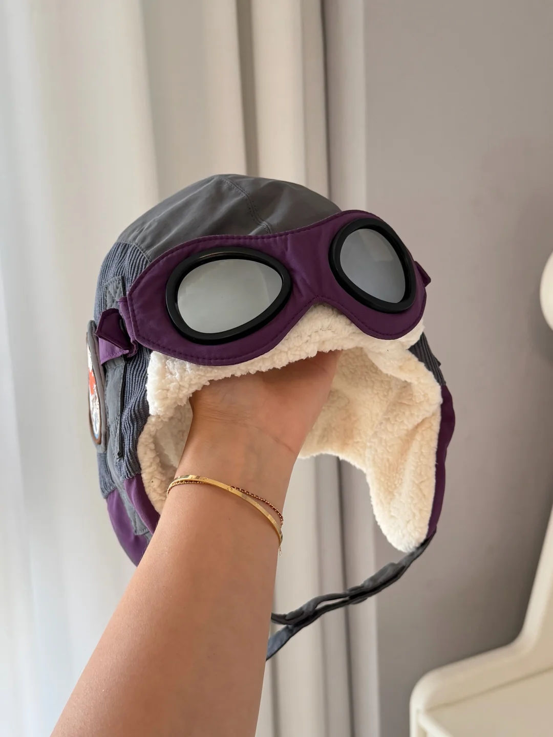 它是经典的飞行员款式,还搭配了个小护目镜