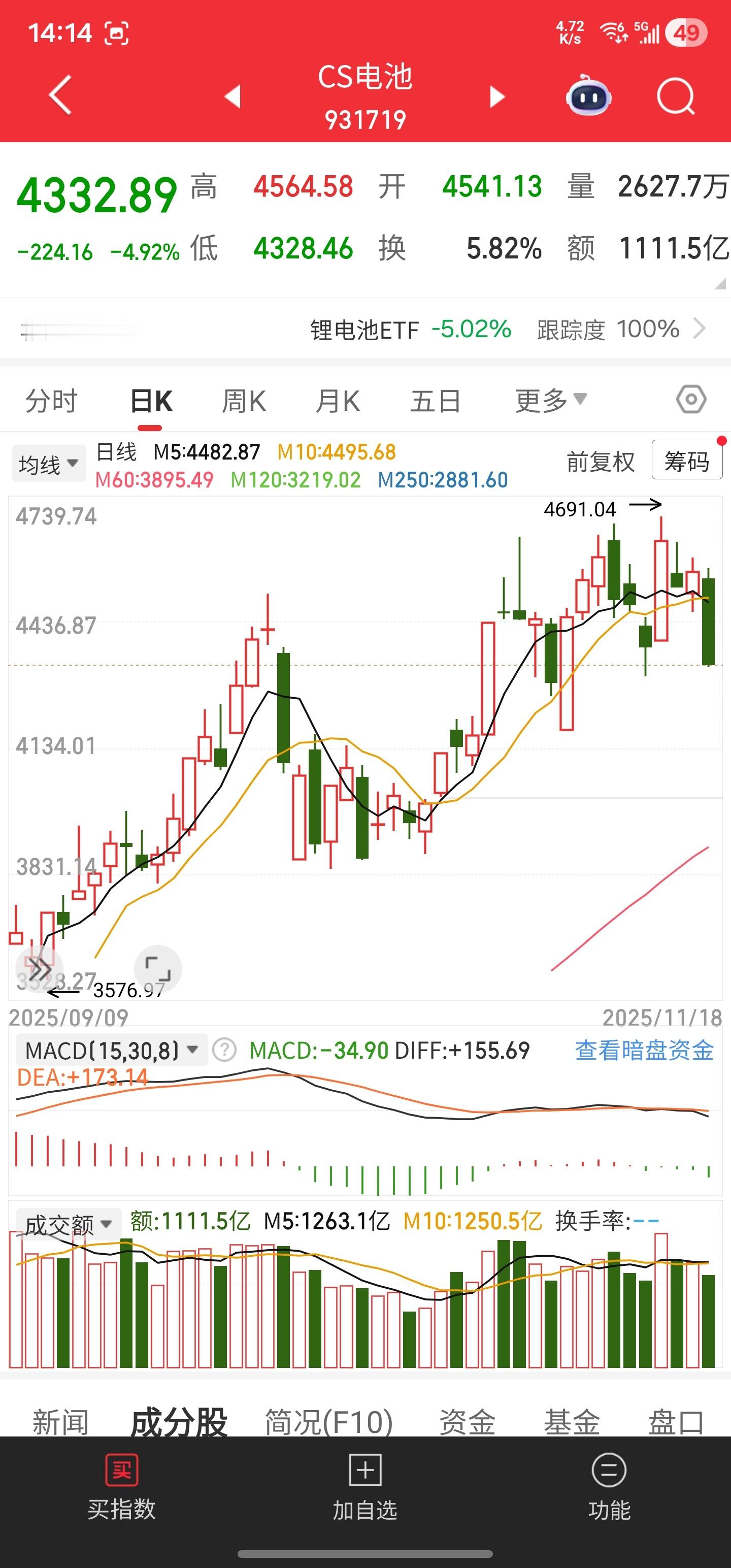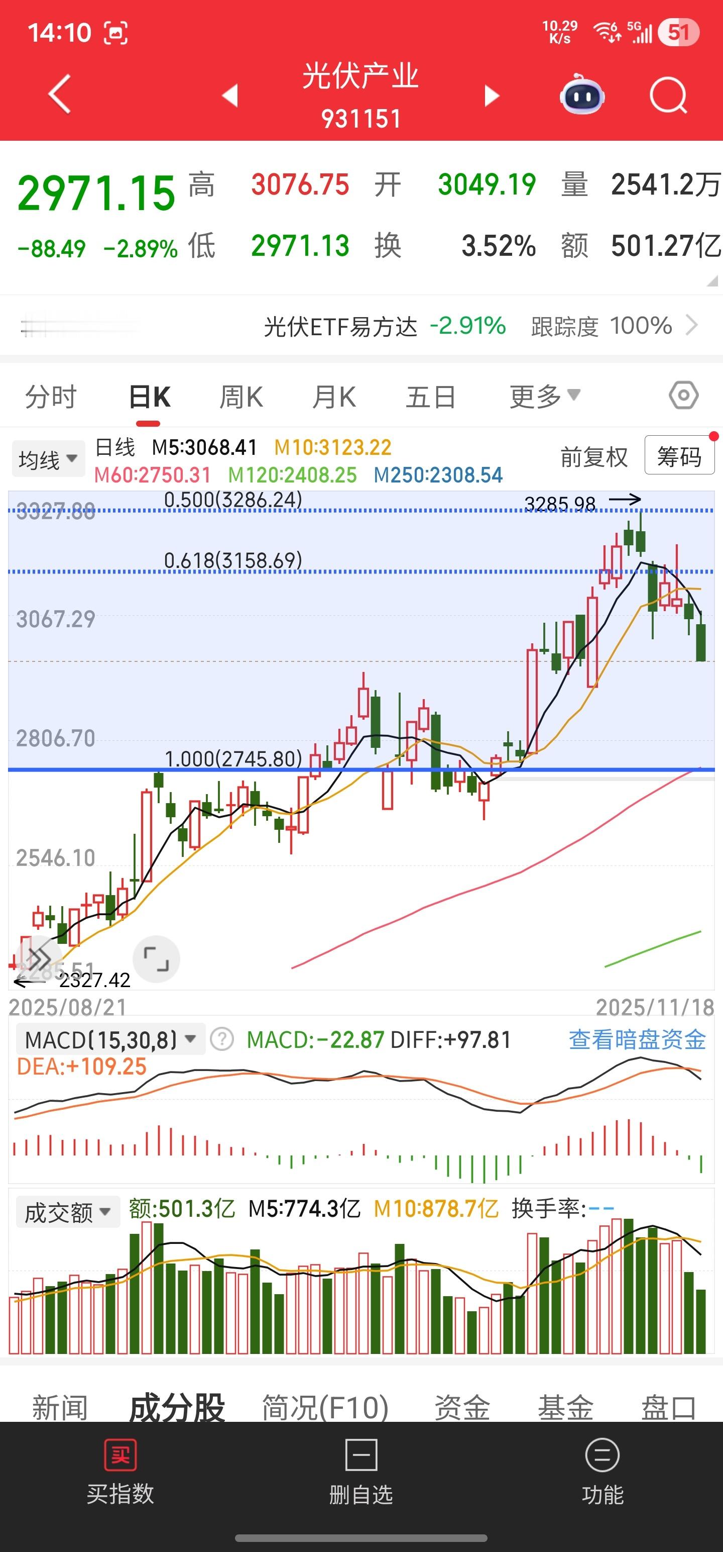 光伏11月涨幅也跌尽了,最高10%跌下来的。既然没突破3300,那今天再接回前面减仓的10%,当个小波段。ps:电池再次(第三次)跌破10日线,振幅实在太大了