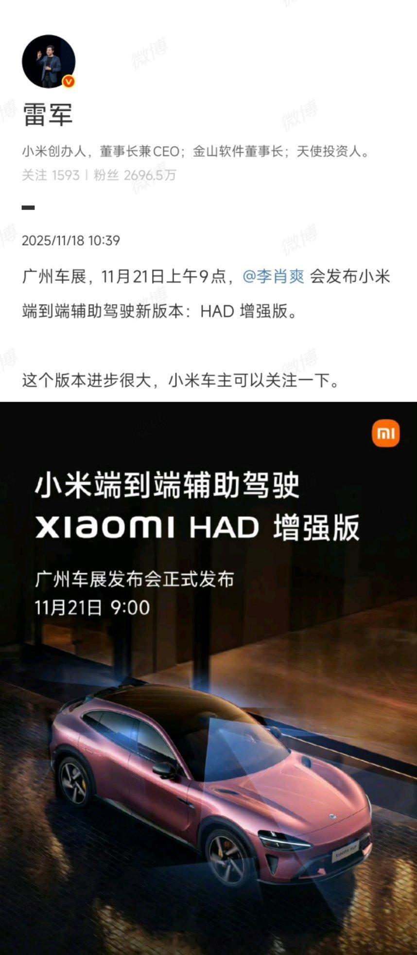 小米11月21日将发布端到端辅助驾驶新版本HAD增强版,雷军称进步很大,建议车主