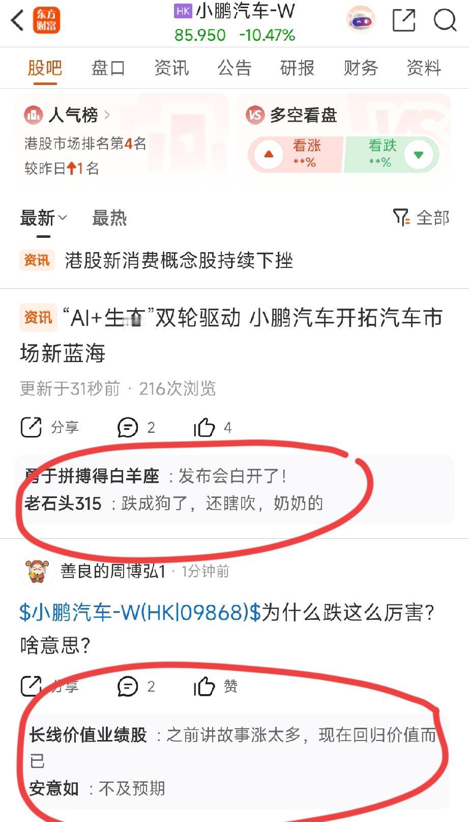 哎,愁死我了!买的小鹏股票,一路飘绿,今天居然跌了10个点,这也太狠了吧!我就是因为看到小鹏发布机器人,当时觉得这小鹏机器人走路特别丝滑,还会走猫步,心想小鹏妥妥的高科技公司,前途肯定一片光明啊对标特斯拉,股票甚至能超过寒武纪。谁能想到股价一路下跌,啥时候才能回本啊!