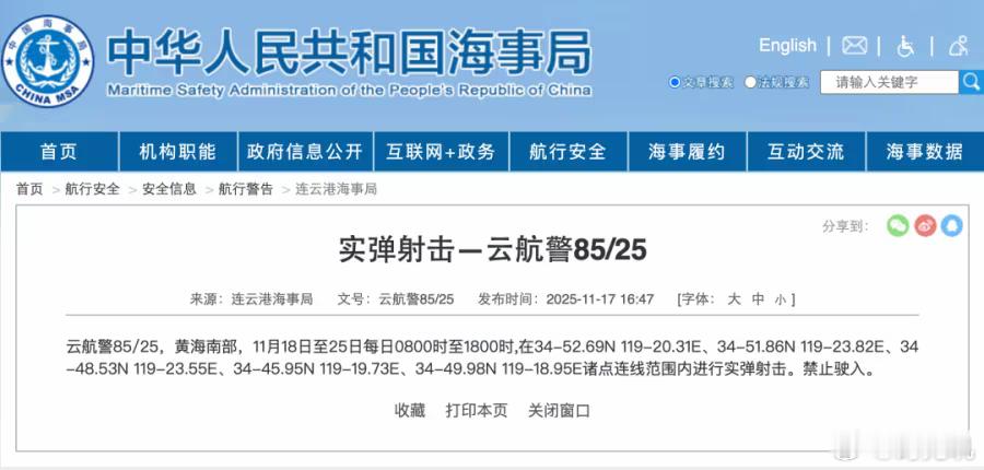 11月17日消息,连云港海事局发布航行警告,11月18日至25日每日8时至18时,黄海南部部分海域进行实弹射击,禁止驶入。