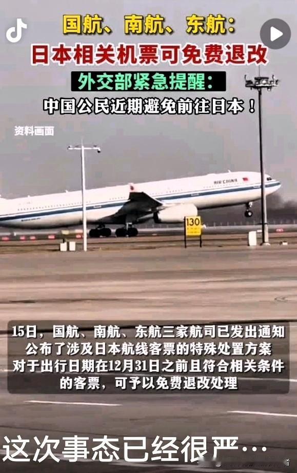 赴日游客哭晕!机票能免费退改,却半点开心不起来,真相太揪心! 一觉醒来,不少计划赴日旅游的朋友收到意外通知:国航、南航、东航等8家航司密集发布日本航线特殊处置方案,11月15日特定时间前购票、出行日期在11月15日至12月31日的客票,可免收手续费退改。 这波突然的退改福利,没让游客欣喜,反倒揪起了心——大家纷纷猜测背后缘由,担心期待已久的日本之行彻底泡汤。 而真正的原因,比想象中更值得警惕:咱们驻日大使馆已明确提醒公民近期避免前往日本,核心导火索是日本领导人发表涉台露骨挑衅言论,严重破坏中日人员交流的良好氛围,这才促使航司推出便民退改政策,并非网传的“严重核泄漏”。 即便有官方风险提示,仍有少数人执着于赴日:有人心心念念日本料理的生鲜,有人惦记着温泉度假的惬意,还有人冲着奢侈品采购计划不肯放弃。 在我看来,这种只图个人私欲、无视国家提醒的行为,实在让人难以认同。 国家在特殊时期的提醒,从不是限制自由,而是对公民安全与利益的负责。作为东大公民,我们理应懂得“国强家安”的道理:祖国的尊严需要每一个人维护,国家的发展需要每一个人助力,荣辱与共才是和谐共生的根基。 日本最在意的就是中日间的旅游与贸易往来。可总有少数人,为了一己之私无视国家立场,变相为他国站台。 别忘了,我们的每一次选择都连着家国大义,盲目赴日不仅可能面临未知风险,更辜负了祖国的守护。 旅游可以暂缓,购物可以替代,但国家尊严不容妥协。支持祖国的决策,响应官方的提醒,不是束缚,而是对自身负责,更是对家国的担当。 愿每一位国人都能清醒认知,在个人需求与国家利益之间做出正确选择,同心协力守护我们共同的家园! 个人出行自由需以国家利益与安全提醒为前提,真正的自由是“明辨利弊后的理性取舍”,而非无视大局的私欲放纵。 航司免费退改本质是国家为公民提供的“风险缓冲”,而非纵容盲目出行的便利。日本领导人涉台挑衅已触碰国家核心利益底线,此时执着赴日,看似是追求个人旅游需求,实则是对国家立场的漠视。作为公民,个人选择从来都与家国命运紧密相连,尊重国家提醒、主动规避风险,既是对自身安全的负责,更是对国家尊严的守护——这种“取舍”不是放弃自由,而是以理性践行公民责任,让个人选择与国家立场同频共振。 我个人觉得吧,国家都明着提醒别去日本了,航司还特意给了免费退改的便利,咱真没必要硬凑。日本领导人都触碰咱国家底线了,还执着于吃料理、买奢侈品,实在不划算。个人这点小需求啥时候不能满足?跟着国家节奏走,既安全又护家国体面,多值啊! 各位读者友友们,大家对此事有何看法?欢迎评论区留言讨论一下!