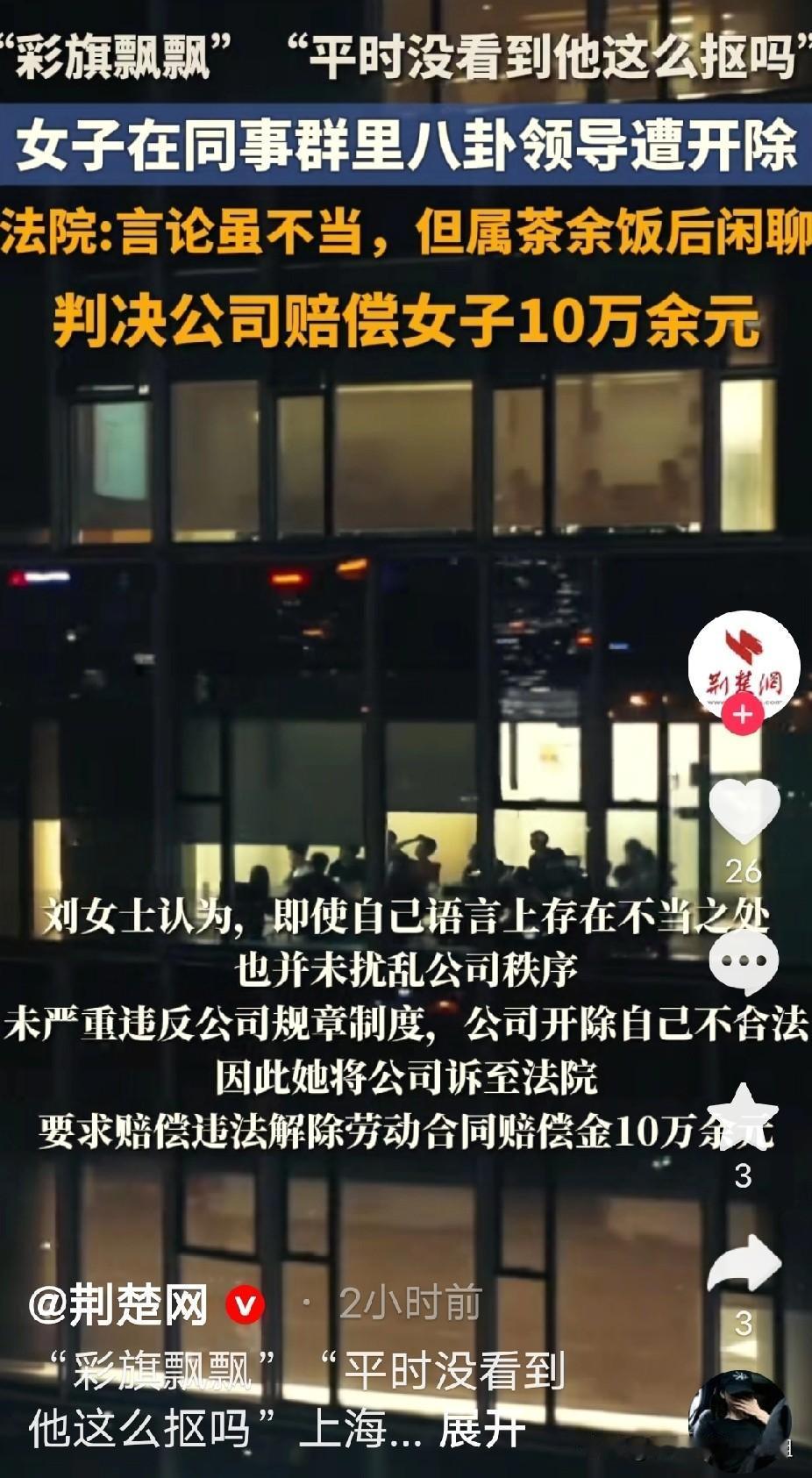 祸从口出!上海,女子在办公室同事群里,八卦领导是家中红旗不倒,外面彩旗飘飘,结果被人转发。领导得知后,当众把聊天记录,在公司大会上宣读。事后,公司以女子散布谣言,诽谤他人,损害公司声誉为由,直接将她开除。女子大喊冤枉:八卦领导私生活的话题不是我提的,我不过是搭了几句闲话,被公司开除,罪不至此!于是女子将公司告上法庭,要求赔偿10万。法院这样判了! 这事儿到了法院,法官的看法和公司截然不同。上海青浦法院审理后认为,刘女士在微信群里的附和言论确实不妥当,但那个群只有十几个人,属于相对封闭的空间,聊天内容本身并不具备大规模传播的属性。后来事情闹得满城风雨,并不是刘女士主动散布的,而是聊天记录被泄露后,领导又在公司大会上当众宣读,这才把事态给放大了。法院特别指出,刘女士并非那些八卦话题的发起者,只是在别人聊天时顺便搭了个话,这些纯属茶余饭后的闲聊,远远没到“严重违反规章制度”的程度。公司手握管理权,明明有警告、批评教育这些更温和的处理方式可以选择,却直接用了开除这个最严厉的惩罚,下手实在太重了,违背了限度原则。最终,法院判决公司属于违法解除劳动合同,需要支付刘女士10万余元的赔偿金。 同样是员工发表不当言论,结果却可能天差地别。北京有个员工因为不满办公室有人吸烟,在朋友圈用极端词语辱骂领导,结果法院支持了公司的开除决定。另一个案例里,员工小叶深夜在朋友圈用恶劣语言攻击同事,公司要求他澄清却遭到拒绝,之后将他开除,法院也认定这次解雇是合法的。关键差别在哪里呢?看来不在于领导是否觉得“被冒犯”,而在于言论的性质是纯粹发泄情绪的个人攻击,还是基于事实的批评。就像上海浦东法院处理的另一个案子里,员工邱某在网上发帖说公司差别对待员工、拖欠赔偿金,甚至称公司为“垃圾公司”,但法院认为他的言论是基于存在的劳动纠纷,并非捏造事实,因此不构成对公司名誉权的侵害。法律保护的似乎是那些“有根据的吐槽”,而不是带有侮辱诽谤的恶意中伤。 这起案件背后其实是公司管理权和员工个人权利之间的一场微妙的拔河。法官在裁决时强调了一个重要原则:“用人单位行使管理权应遵循合理、限度和善意的原则”。公司制定的规章制度不能成为一把随心所欲、打击报复的“橡皮尺”,尤其是当条款本身含糊不清,什么算“不当行为”、怎么罚都说不明白的时候,就更不能作为开除的充分依据了。领导觉得权威受损面子上挂不住,一拍桌子就想让人滚蛋,这种简单粗暴的思维在法律面前常常是行不通的。反过来对员工来说,私人小群里的闲聊和公开平台的发言界限不同,但也不是绝对的“法外之地”,核心在于坚守“基于事实,理性表达”这根底线。一句“羡慕工资按时发放”和捏造领导私生活谣言,性质完全不同,法律也会区别对待。 各位读者你们怎么看?欢迎在评论区讨论。