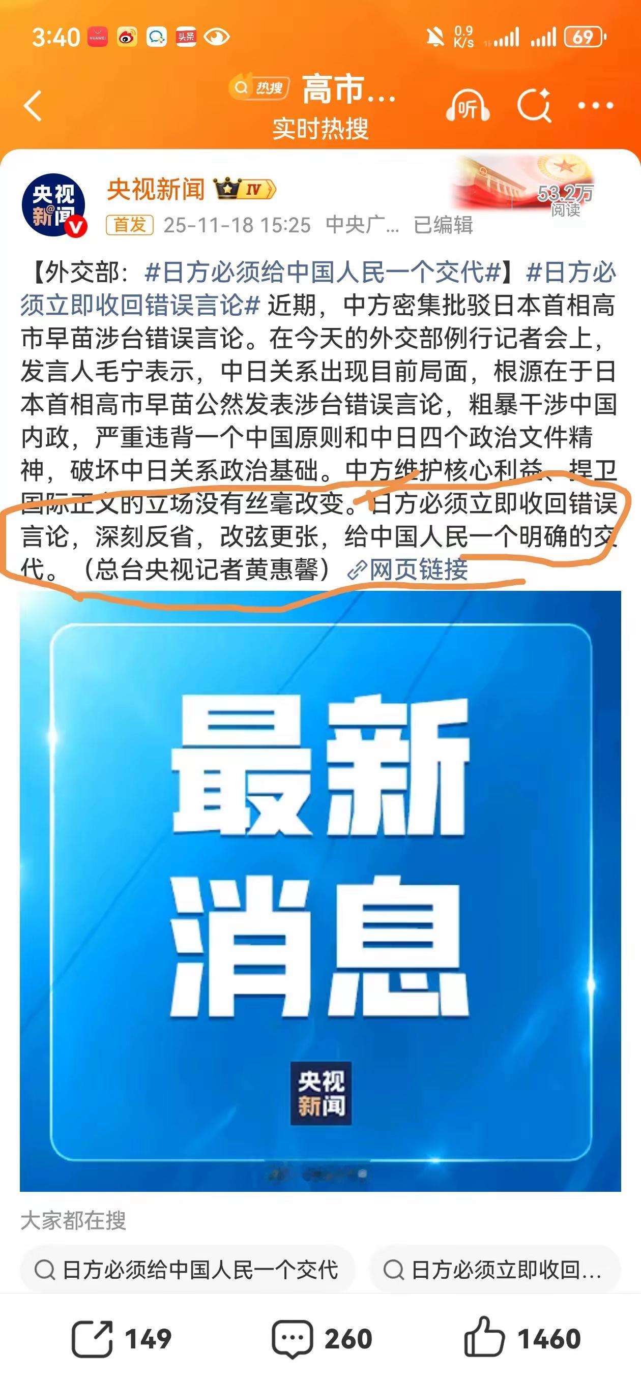 完全定调了!这次要不就是高市早完下台,日本改弦更张;要不就是日本一意孤行,中日关系走向破裂,中国未来进入打日本警告美欧的新阶段! 东京街头飘起的政治硝烟,早已穿透外交辞令的薄纱。那位执着于右翼路线的政治家,正将东亚推向危险的十字路口。历史记忆从未褪色,靖国神社的烟火与核污染水的阴云,不断侵蚀着两国关系的基石。 数据揭示残酷现实:去年中日贸易额骤降12%,半导体设备出口管制直接冲击产业链。日本经济团体联合会调查显示,七成日企担忧双边关系恶化影响业务。冰冷的数字背后,是无数家庭生计承受的灼热压力。 东亚格局正在经历深刻重塑。当某些政客沉醉于地缘博弈的幻梦,区域国家已悄然调整航向。RCEP框架下的经济融合与安全对话的裂痕,构成这个时代最鲜明的矛盾图景。 回望五十年前田中角荣的破冰之旅,当时政治家展现的远见令人感慨。那份载入史册的联合声明,字里行间跃动着超越分歧的智慧。如今某些人却执意要拆毁前辈搭建的桥梁。 中国民众的情绪火山即将喷发。社交媒体上“历史真相”话题阅读量突破30亿次,这是民族记忆的觉醒。年轻一代用4K技术修复历史影像,让黑白胶片中的苦难重新呼吸。 国际观察家注意到微妙转变。东盟国家纷纷加强与中国的海洋合作,日本传统盟友韩国也在调整姿态。世界格局的棋盘上,孤立主义正在让某些国家付出代价。 核污染水排海成为照妖镜。东京电力公司的谎言接连被揭穿,太平洋沿岸国家集体愤怒。生态灾难没有国界,蓝色星球的命运不容少数政客赌博。 我们站在历史的转折点上。是选择共同繁荣的阳关大道,还是重蹈对抗的老路?这个答案不仅写在政府文件里,更刻在每个普通人的生活中。和平与发展从来不是天上掉下的礼物。 各位读者你们怎么看?欢迎在评论区讨论。