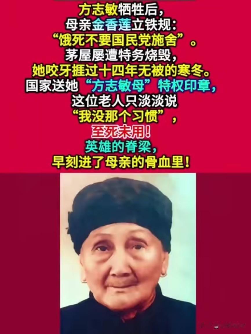 方志敏烈士牺牲以后,老母亲过着悲惨的生活,十四年后,新中国成立,老人家被接到北京,总理安排人给老母亲刻了一枚“方志敏母”的印章,告诉老人家,随便在哪里,有这枚章,缺什么就要。但是,这枚章一辈子没有用过,老人家说,用这上面的东西,就像喝儿子的血一样。 其实这段记载里有两处细节和史实有出入,得跟大家说清楚才不算误导。老人真实名字叫金香莲,1878年生于安徽歙县,父亲是前清秀才,教过私塾也行过医,后来兵荒马乱才家境赤贫 。她早年就丧了夫,拉扯着几个孩子长大,不光方志敏为革命献身,另一个儿子也走在了为国为民的路上,家里就剩她孤苦伶仃一个人。 方志敏牺牲后,国民党反动派没放过他的家人,家里的房屋先后被烧毁十几次,还到处搜捕“共匪家属”,老人家只能东躲西藏勉强活命。她给自己立下两条铁规:一不讨米要饭,二不要国民党的施舍,哪怕饿肚子也不肯玷污儿子的信仰。有一次,婶婶带着她走几十里山路找方志敏,想让当省苏维埃主席的 儿子拿点饷银,给她做条裤子、给婶婶买些食盐,可方志敏只能含泪解释,自己是穷人的主席,没一分钱能补贴家用 。 1949年5月弋阳解放那天,一位解放军团长专程找到她,跪在地上说“娘,我们都是您的儿子”,老人这才知道盼了十四年的儿子早已牺牲,当场泪流满面。新中国成立后,不是总理把她接到北京,而是方志敏的亲密战友、江西省首任省长邵式平,把她接到了省城南昌。谢觉哉同志还代表中央人民政府,专门给这位英雄母亲授了勋章,连朝鲜人民军的代表都特意来看望她。 邵式平知道老人生活简朴,当时实行供给制,就给她刻了一枚自己名字的图章,明确说不管在南昌还是弋阳老家,缺什么生活用品,凭这枚章就能盖章领取。老人把这枚图章当成珍宝,用布包得严严实实藏在身边,可直到1957年去世,一次都没拿出来用过,公家的东西更是没领过一样。 有人不解地问她,这是党和政府的心意,为啥不用?老人只是红着眼眶摇头,说志敏为了国家连命都没了,自己怎么能借着他的名头占便宜。这不是空话,是刻在骨子里的家风——方志敏经手数百万元革命经费,自己却清贫到被俘时连一个铜板都搜不出来,这种洁白朴素的信念,早就传给了母亲 。 她的后人也把这份家风守得牢牢的,女儿方梅从小寄养在农户家,17岁才和母亲团聚,后来退休后仍住在南昌老城区的老旧居民楼里,从没借着烈士女儿的身份谋过私利。这枚没被使用过的图章,见证的不只是一位母亲的骄傲,更是革命者全家“清贫自守”的底色,这种不占公家便宜、不辱烈士名节的骨气,比任何物质都珍贵。 各位读者你们怎么看?欢迎在评论区讨论。