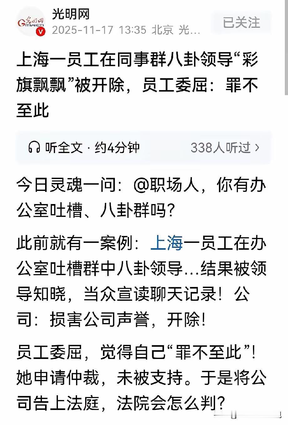 这起案件反映了现代职场中因言行不当引发的法律与伦理问题,值得从多个角度进行分析。 员工的言行应有谨慎意识 刘女士在微信小群中对领导的私生活进行八卦、调侃,属于个人言语行为。虽然是封闭的小群,但涉及领导的隐私和名誉,很可能构成侵权或损害公司声誉。不论是在何种范围内,议论他人隐私都应慎之又慎,避免误伤他人。 公司管理与员工保护的平衡 公司依据“散布谣言、恶意攻击、损害声誉”等理由,将刘女士解雇,体现公司试图维护秩序与形象的努力。 然而,法院审理认为,刘女士并非发起人,且涉事微信群虽有影响,但事态的扩散关键在于领导在大会上公布聊天内容,属于事件的核心破坏因素。 因此,单纯根据她的参与进行解雇,缺乏充分证据证明其行为严重到不可挽回的程度,属于过度惩罚。 言论的公众影响与个人名誉权 刘女士的发言“家中红旗不倒,外面彩旗飘飘”虽带有调侃意味,但没有事实依据,可能侵犯领导的名誉权。 根据民法典,任何侵害他人名誉的行为都应受到法律追究。即使是在小范围群聊中,涉及他人隐私与声誉,亦应立足法律底线。 法律判决反映的合理性 法院最终判决公司赔偿刘女士10万余元,说明公司在处理员工行为时应遵循合法、合理原则。 公司若因员工轻微过错或事后不能证明严重危害公司利益而解雇,可能面临违法责任。 而员工过错虽存在,但不至于导致全面开除,法院判其获赔,是对双方权益的平衡。 从法律与伦理角度的启示 职场中应规避八卦、隐私议题,树立专业形象。 员工应对自己的言行负责,避免散布不实言论。 企业应依法依规管理,合理惩戒,避免过度解雇或侵权。 在处理类似事件时,法律应成为公共秩序和个人权益的保障,不应由单方面的“严苛”裁决来裁定。 总结: 这件事情提醒我们:职场言行既要自律,也要合理依法行事。过度解读或管理中的失衡,可能带来法律风险。作为员工,应谨言慎行,尊重他人隐私和名誉;作为企业,要依法合理管理,保护员工权益。最终,法律的公正判决有助维护一个公平、理性的职场环境。 如果你有更多法律咨询或职场困惑,欢迎随时提问!职场言行边界 职场道德观