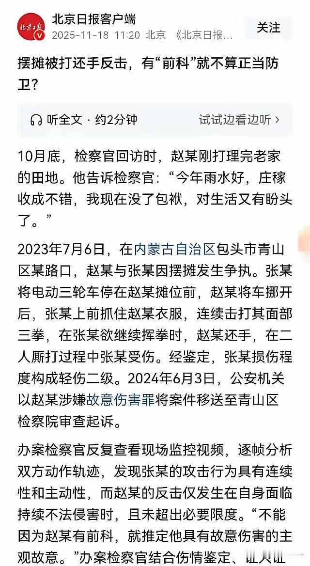 根据您提供的案情和相关法律规定,以下是对赵某正当防卫的分析和解读: 一、正当防卫的法律要素 不法侵害的存在:必须有正在进行的不法侵害行为。在本案中,张某突然揪住赵某衣领并挥拳攻击,明显构成不法侵害行为。 防卫的时间:防卫行为必须是在不法侵害正在进行时进行。根据案情,张某已对赵某实施了连续攻击,此时正处于侵害的持续过程中,赵某的反击符合时间条件。 防卫手段的必要性:应采取必要的手段制止侵害。赵某的反击是在应对张某的持续攻击,没有明显超出必要限度。 防卫的目的:是为了保护自身或他人的合法权益免受不法侵害。在本案中,赵某试图制止不法攻击,具有正当防卫的目的。 二、正当防卫与故意伤害罪的区别 正当防卫是一种合法行为,旨在保护合法权益免受不法侵害,不负刑事责任。 故意伤害罪则要求行为人具有伤害他人的故意,且行为超出防卫必要限度,才构成犯罪。 三、案件中的判断 事发过程中,赵某在张某连续攻击时反击,符合正当防卫的条件。 根据监控和证人证言,张某先动手,而且攻击具有连续性和暴力性。 赵某的反击行为未超出必要限度,没有恶意伤害他人,而是为了制止不法侵害。 四、结论 依据《刑法》第二十条及相关司法实践,赵某在案发当时的行为符合正当防卫的构成要件,不能仅仅因为他有前科就简单认定为故意伤害。检方最终认定赵某不构成故意伤害罪,做出了不予起诉的决定,符合法律规定和案件事实。 总结:赵某的行为应认定为正当防卫,不负刑事责任。正当防卫 刑法的正当防卫