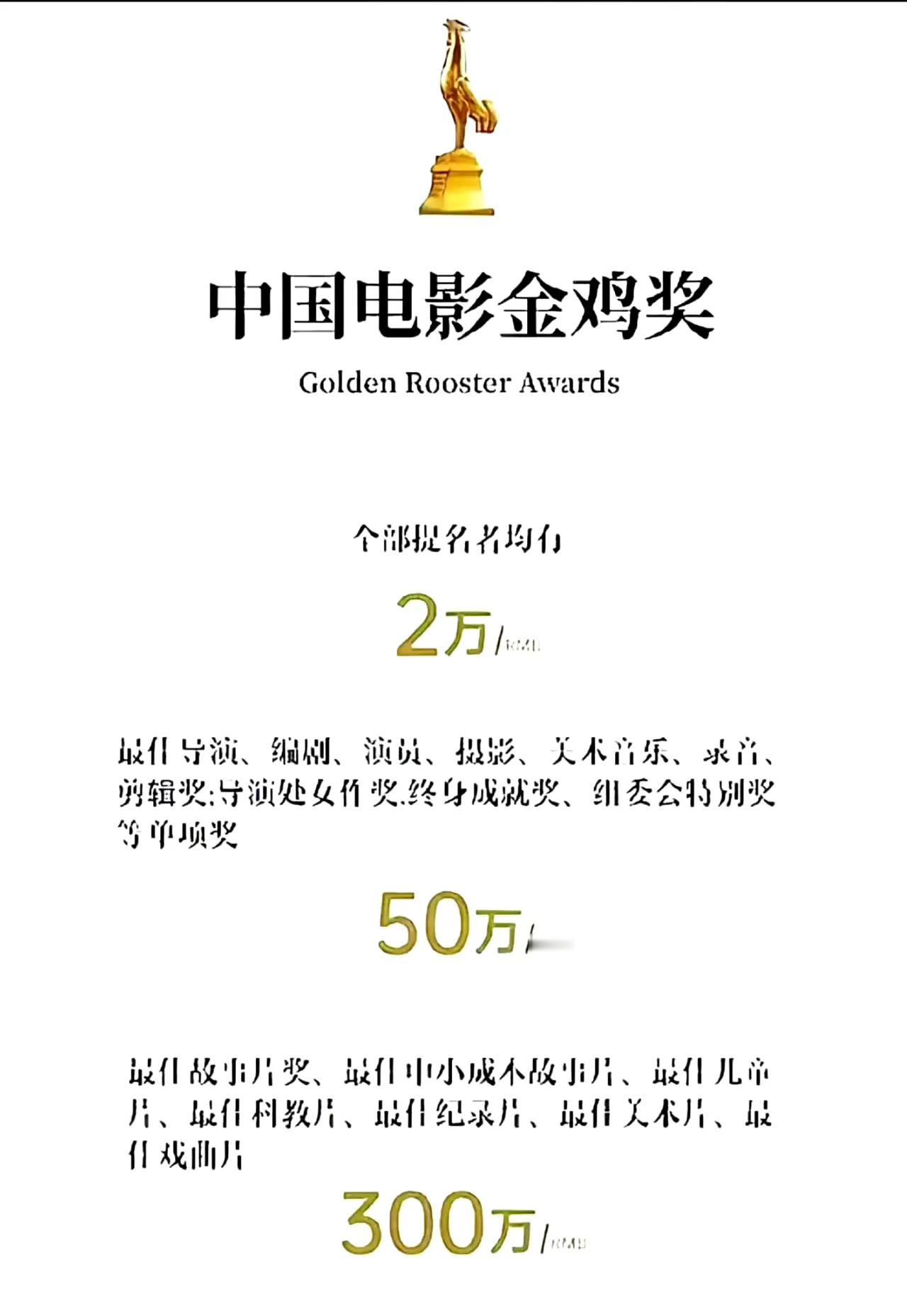 金鸡奖的奖金真的是好高,不过明星们应该也看不上这点钱吧! 网传金鸡奖的奖金曝光,提名者均能获得2万元奖金,最佳导演编剧那些则是可以获得50万元奖金,另外一个最佳故事片等奖项则可以获得300万元奖金。 提名5万奖金,其实明星们更看重的应该是名声,这点奖金在他们眼里根本不算什么。不过这些电影奖的奖金还是比较高的,难怪大家挤破头都想得奖。