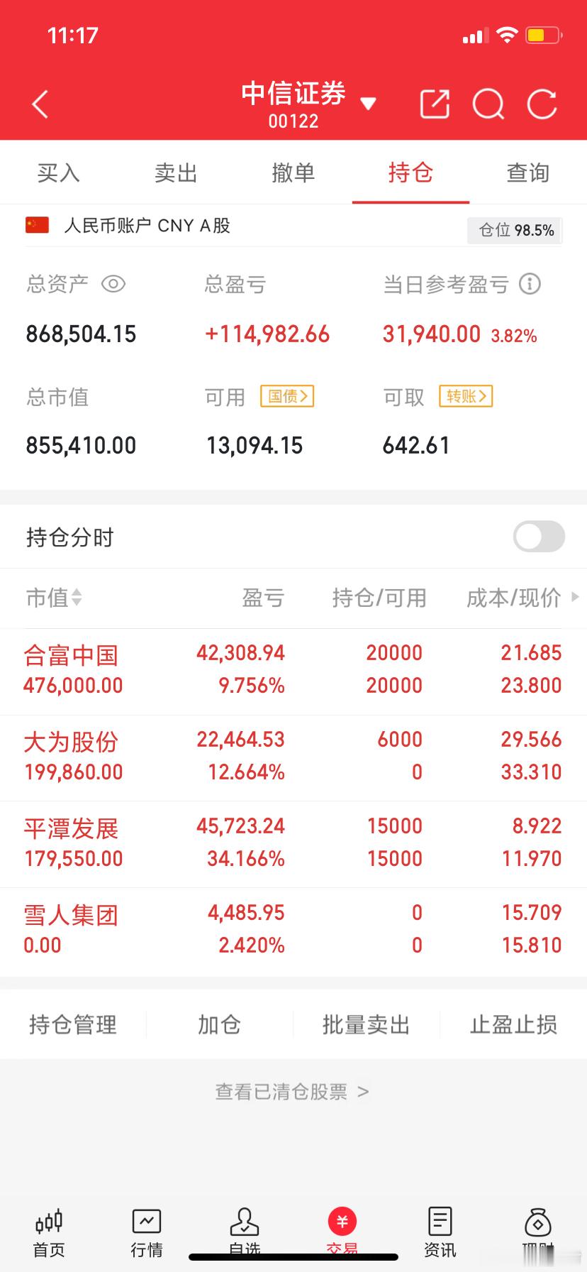 阿城实盘,今天最新操作记录:今日卖出: 雪人集团今日上车:大为股份今日持仓: 平潭发展(关小黑屋) 合富中国(关小黑屋) 特别声明:我开实盘的目的主要是为了记录我对A股走势的思考和研判,并用于记录我自己的操作笔记,是我积累股票投资知识和反省操作失误的一个平台,绝不是读者朋友买卖股票的依据和理由,不具备投资建议,据此操作,需自行承担投资后果,股市有风险,投资需谨慎