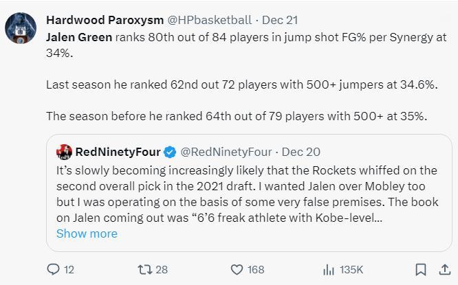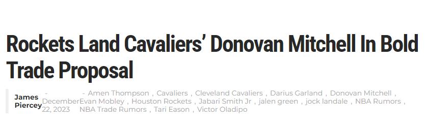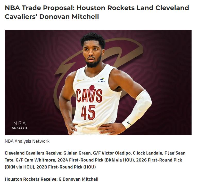 格林逐年退步引不满!美媒建议火箭8换1梭哈米切尔:白魔也成筹码 杰伦-格林貌似已经成为鸡肋一般的存在,食之无味弃之可惜,本赛季至今场均31分钟,拿下17.4分4.4篮板3.2助攻0.48抢断0.44盖帽,命中率40%,三分命中率33%,多数比赛效率拉胯偶有闪光表现,但他的运动天赋的确是联盟第一档。 一项数据说明他在逐年退步:新秀赛季他跳投命中率35%排500次出手79位球员的64位;上赛季他跳投命中率34.6%,排500次出手球员中62位;本赛季他跳投三分命中率34%,排500名84球员中第80位。 火箭记者纳什-威廉姆斯吐槽格林最大的问题:1.他是一个低效的跳投手;2.档他投篮不中时,火箭在他身上得不到其他任何的帮助; 休斯顿的一档节目中队记SalmanAli谈到了杰伦-格林挣扎的问题:“乌度卡全新的体系让他感到无所适从,他休赛期已经很努力提升跳投可收效甚微,他的技巧库缺乏杀招,他一直将干拔跳投当作杀招只可惜不尽如人意。” 美媒NBA分析网已经建议火箭队在交易截止日前猛烈的追求多诺万-米切尔,他们认为杰伦-格林已经没有培养的必要,他们也认为米切尔在骑士队不会有前途,来大城市休斯顿联手乌度卡与范弗利特是更好的选择。 模拟方案为火箭直接梭哈:杰伦-格林、奥拉迪波、兰代尔、泰特、惠特莫尔、24年篮网/火箭首轮、26年火箭/篮网首轮、28年火箭首轮,直接8换1米切尔,这笔交易可以直接让火箭完美蜕变。 米切尔本赛季场均27.7分5.6篮板5.5助攻1.82抢断0.42盖帽,命中率45.3%,三分命中率35.1%,有了他火箭在关键时刻就有了接管人,他也一直都是外线防守尖兵完美契合乌度卡的体系。