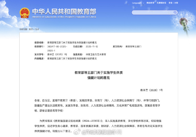 【5部门:】 近日,教育部等五部门联合印发《关于实施学生体质强健计划的意见》,提出学生体质强健计划20条举措。其中包括,充分保障体育时间↓↓基础教育阶段要统筹课内外、校内外,积极推进中小学生每天综合体育活动时间不低于2小时。按照规定课时开齐开足体育与健康课程,鼓励有条件的学校利用地方(校本)课程课时,引导学生加强体育锻炼。充分利用课间开展体育活动,鼓励有条件的中小学校上下午各安排一次不少于30分钟有质量的大课间体育活动。把体育作为义务教育学校课后服务的必要内容,丰富体育项目,满足学生需求。鼓励中小学寄宿制学校在保障学生充分睡眠的前提下建立实施早操制度。高等教育阶段要严格落实体育课程最低学时要求(本科144学时、高职108学时),推动高校面向三年级以上学生(包括研究生)开设形式多样的体育课程,组织学生每周至少参加3次有强度的课外体育锻炼。引导大中小学生周末和节假日积极参加体育锻炼。